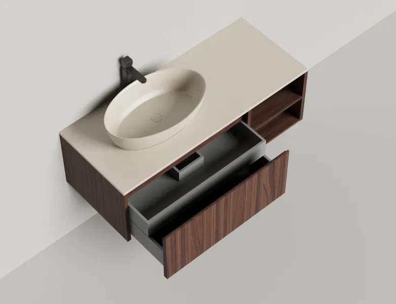 Наполнение для тумбы включает: блоки ячеек для тумб, коврики и комплект внутренней подсветки, которые помогут организовать пространство и создать более удобный доступ к вещам.Тумба DOMINO, дополненная столешницей COSTA из каменного литья S-Stone, гарантирует практичность и простоту ухода.