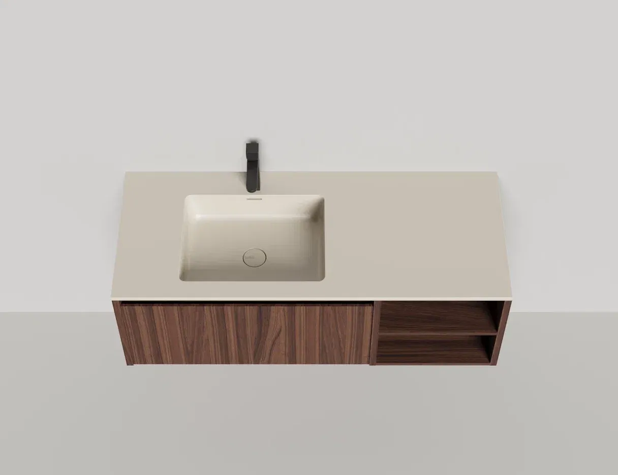 • Тумба и столешница из материала S-Stone в сборе (накладные раковины укомплектованы донным клапаном и поставляются в отдельной коробке)
