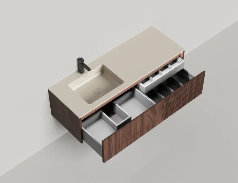 Наполнение для тумбы включает: блоки ячеек для тумб, коврики и комплект внутренней подсветки, которые помогут организовать пространство и создать более удобный доступ к вещам.Тумба DOMINO, дополненная столешницей COSTA из каменного литья S-Stone, гарантирует практичность и простоту ухода.