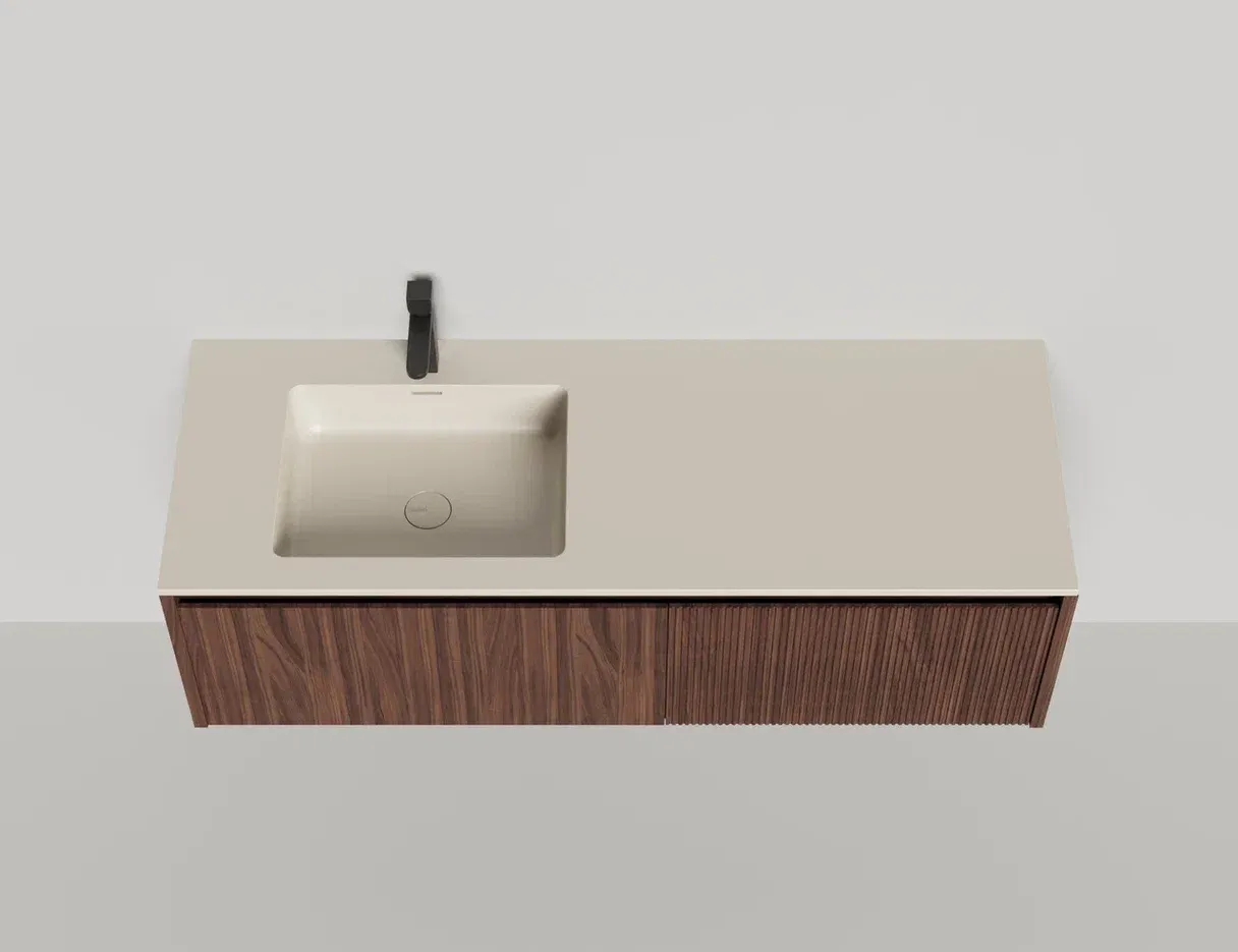 • Тумба и столешница из материала S-Stone в сборе (накладные раковины укомплектованы донным клапаном и поставляются в отдельной коробке)