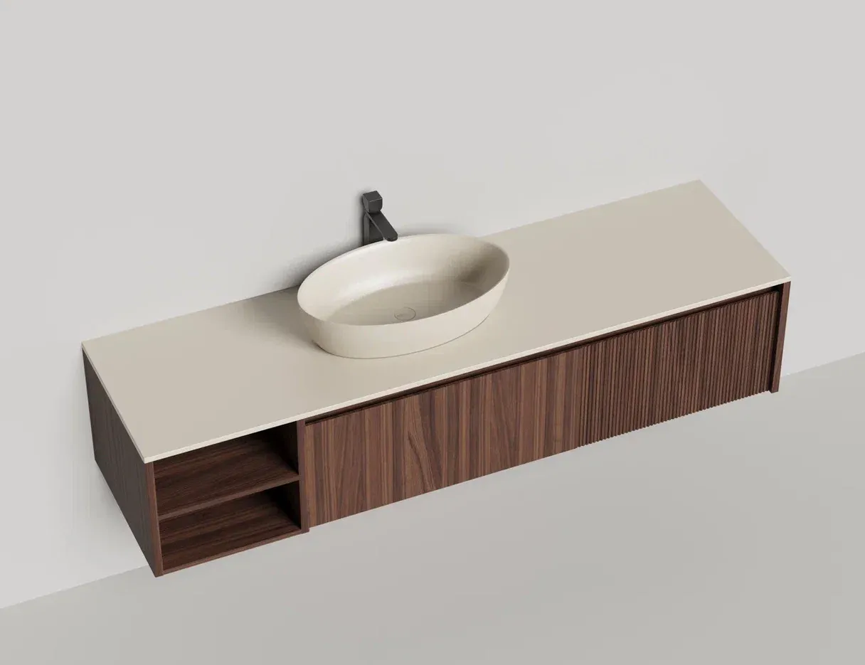 • Тумба и столешница из материала S-Stone в сборе (накладные раковины укомплектованы донным клапаном и поставляются в отдельной коробке)
