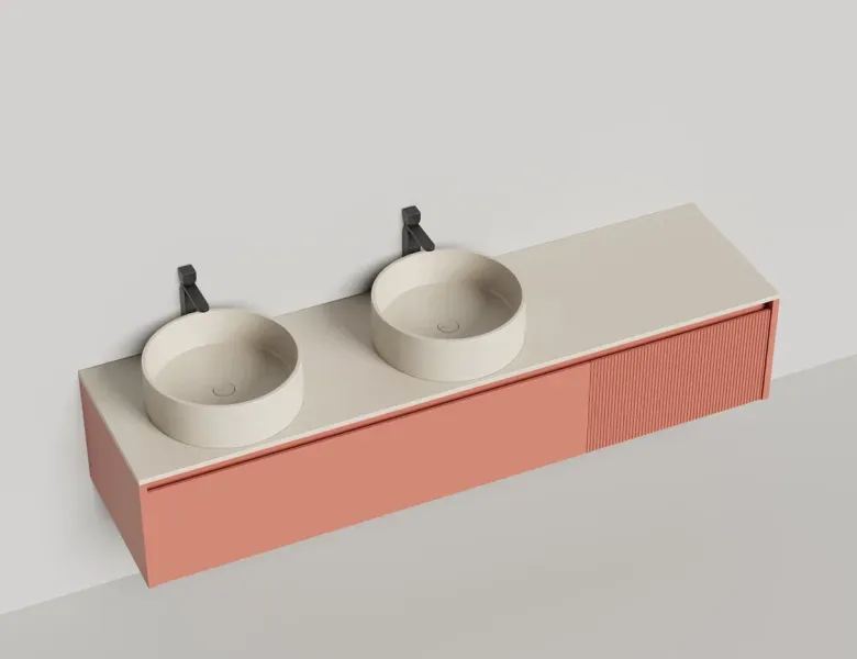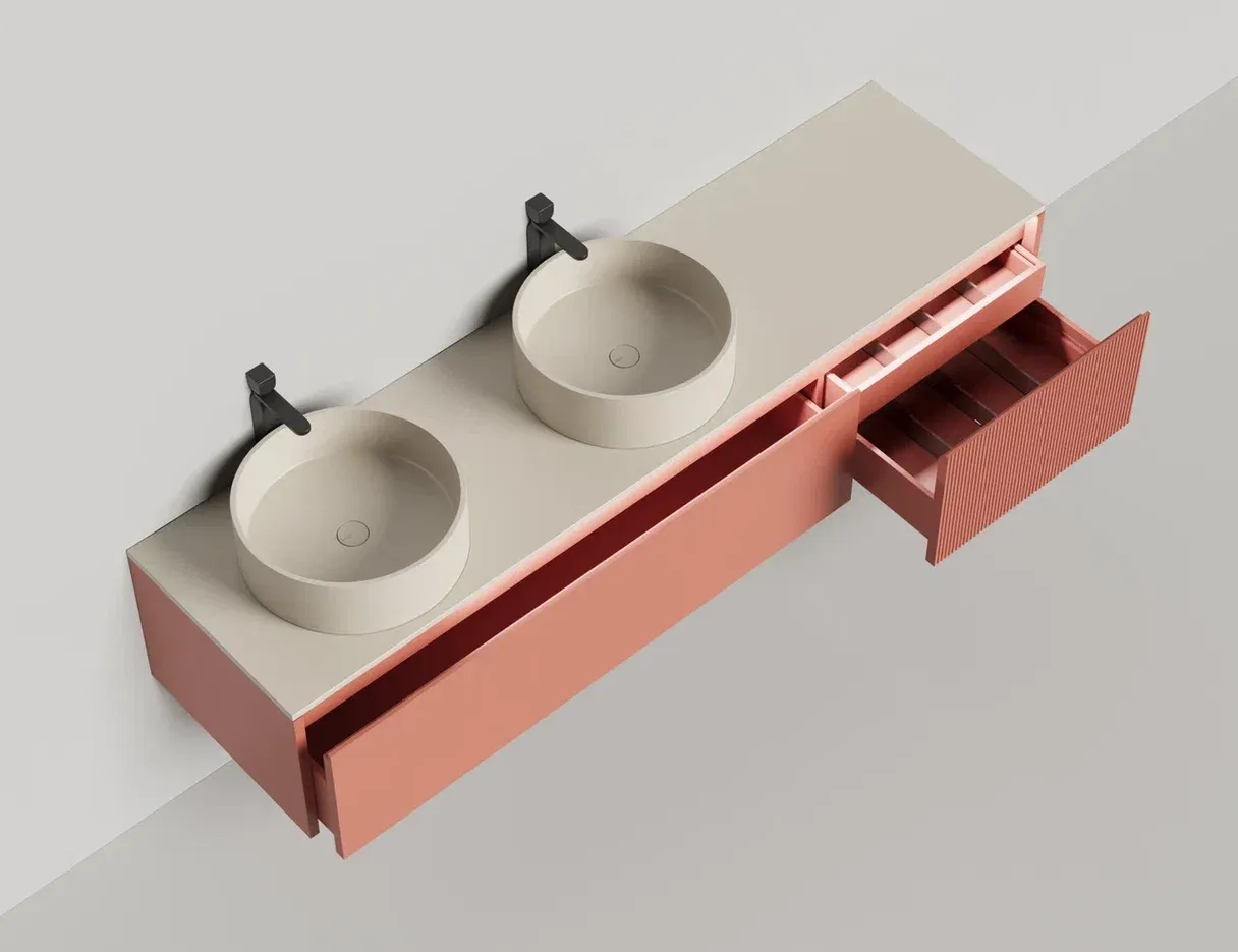 • Тумба и столешница из материала S-Stone в сборе (накладные раковины укомплектованы донным клапаном и поставляются в отдельной коробке)