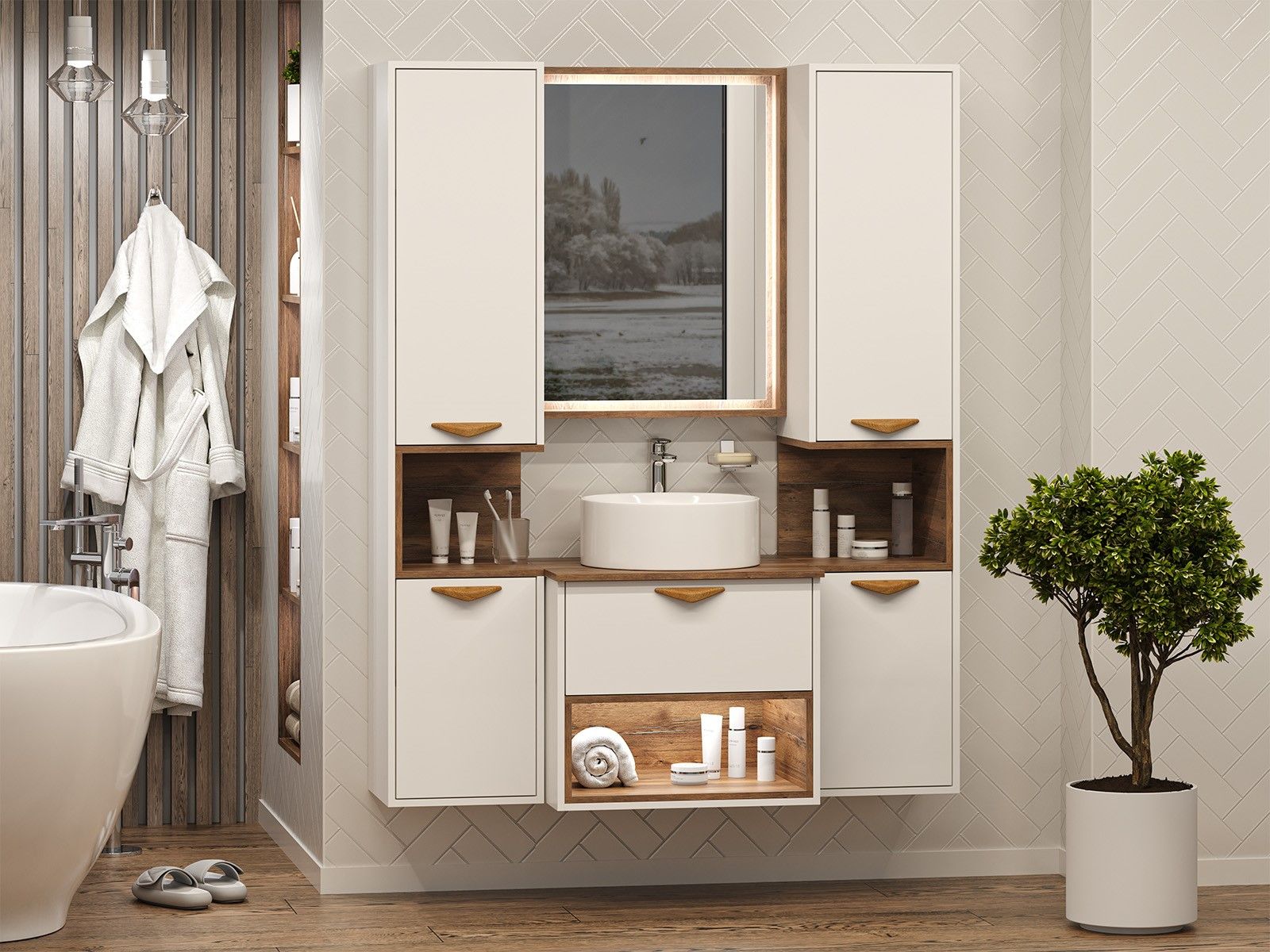 Шкаф-пенал для ванной комнаты – это стильное решение, которое гармонично вписывается в современный интерьер. Его элегантные линии и аккуратные формы создают атмосферу чистоты и порядка, что особенно важно в таком интимном пространстве. Изготовленный из качественных влагостойких материалов, этот шкаф обеспечивает долговечность и надежность, даже в условиях повышенной влажности.Основное преимущество шкаф-пенала заключается в его вместительности. Удобные полки и ящики позволяют организовать пространство и разместить все необходимое: от косметики до бытовых принадлежностей. Каждая деталь продумана для удобства использования, что делает утренние и вечерние ритуалы более приятными.Будь то строгий минимализм или уютный скандинавский стиль, шкаф-пенал станет акцентом, который подчеркивает индивидуальность вашего пространства. Не упустите возможность преобразить свою ванную комнату, добавив в нее этот элегантный и практичный элемент.