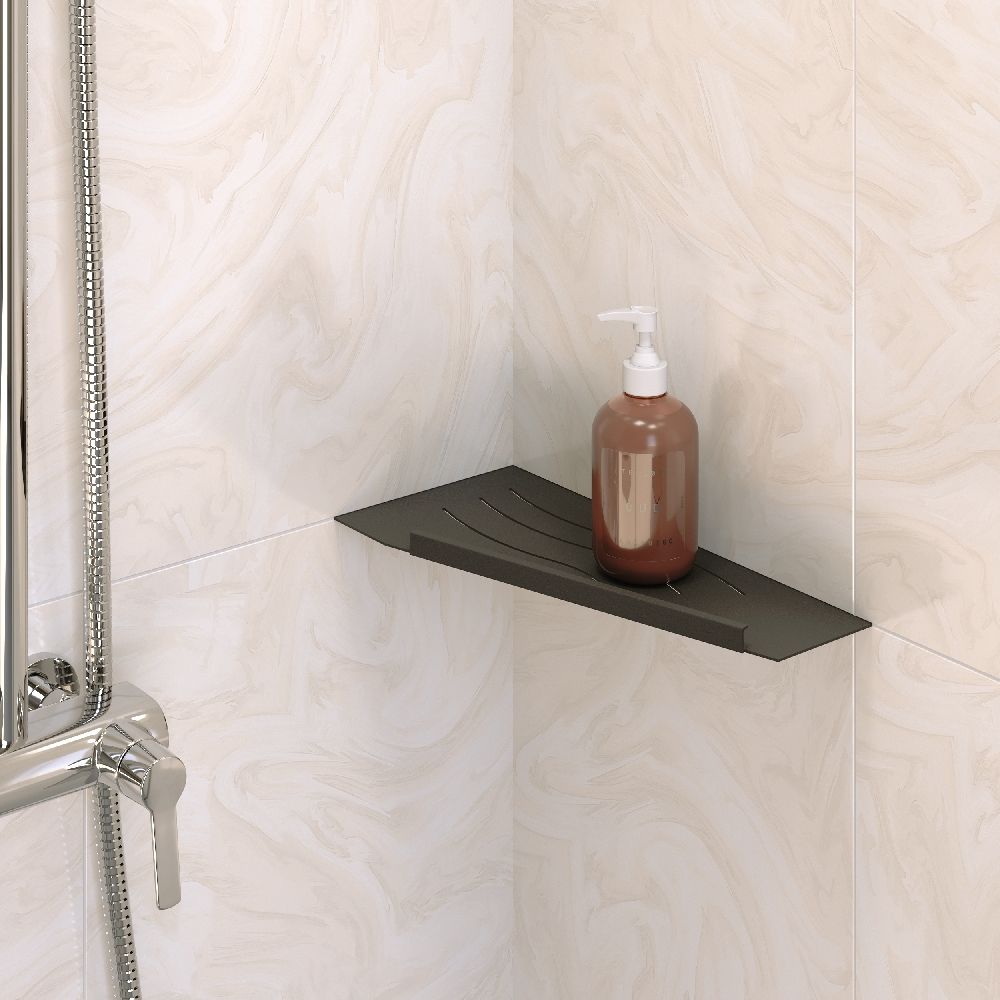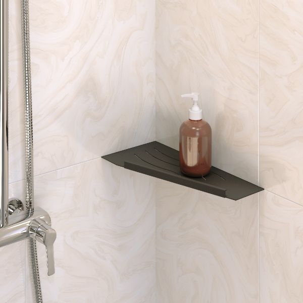Полки для душевой зоны, разработанные специально для монтажа после завершения ремонта, т. е. укладки плитки. Легко устанавливаются в любые угловые зоны в помещении, для этого прорезается шов между плитками, далее полочка вклеивается между плиткой на любой бытовой герметик.