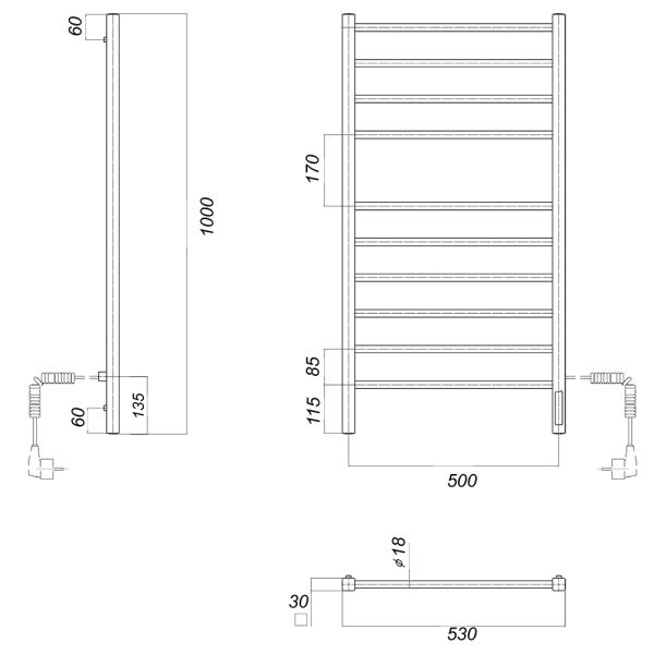 М/о расстояние (межосевое расстояние): 500Количество перекладин: 10Коллекция: КубаТип: электрическиеЦвет: черныйМощность, Вт: 113Ширина (мм): 532Высота (мм): 1000Глубина (мм): 80-90Вес: 6,1Объем: 0,075Тэн/подключение: справаСтрана: РоссияГарантия: 2 года