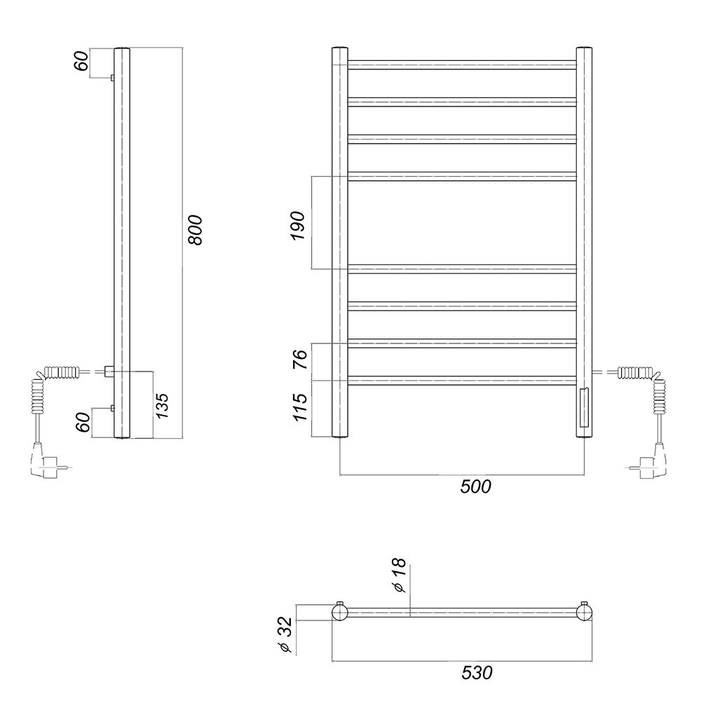 М/о расстояние (межосевое расстояние): 500Количество перекладин: 8Коллекция: МедеяТип: электрическиеЦвет: черныйМощность, Вт: 110Ширина (мм): 532Высота (мм): 800Глубина (мм): 83-93Вес: 5,85Объем: 0,04Тэн/подключение: справаСтрана: РоссияГарантия: 2 года