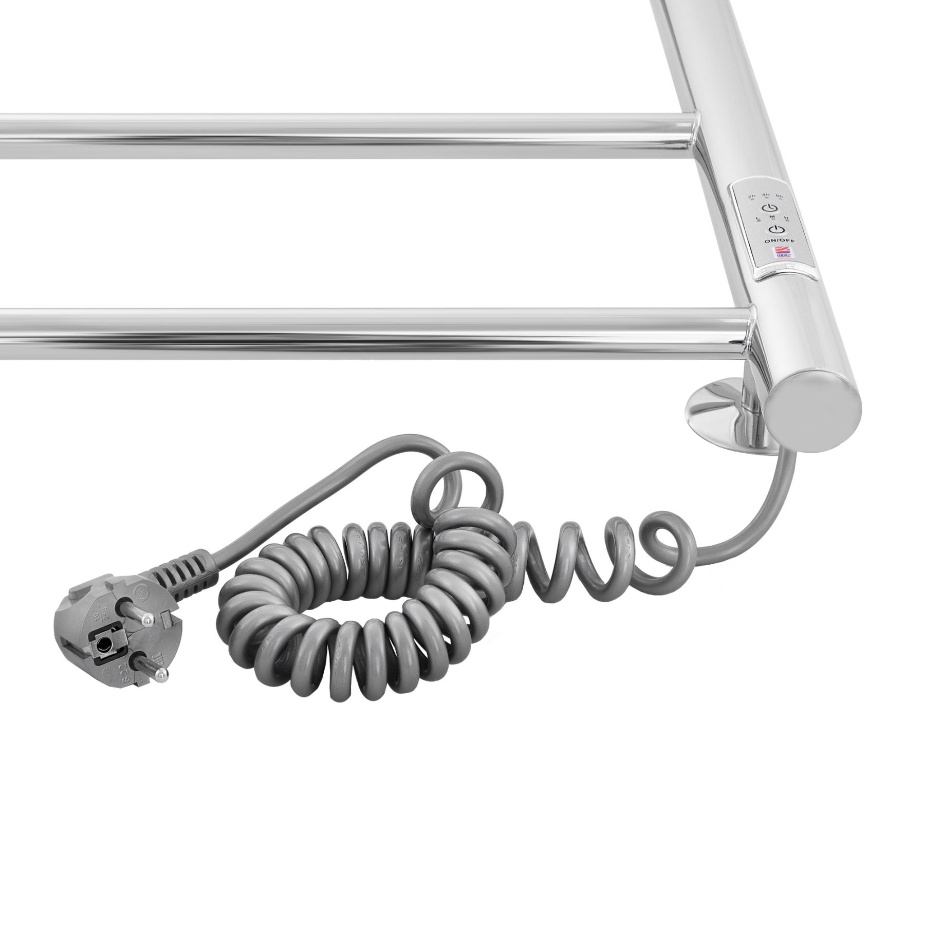 Energy Round Modus – электрический полотенцесушитель с терморегулятором и таймером, выполненный в форме классической лесенки с круглыми в сечении перемычками и полкой, увеличивающей полезную площадь прибора. Нагревается за счет безопасного греющего кабеля в изоляции.Полотенцесушитель оснащен блоком управления с удобной регулировкой мощности (60%, 80% и 100%), а также времени отключения (через 2, 4 или 6 часов). Благодаря невысокой мощности имеет низкий расход электроэнергии. Подключается скрытым или наружным способом.Характеристики: