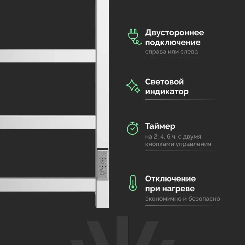 • Управление: Встроенный выключатель на корпусе позволяет контролировать нагрев без дополнительного монтажа терморегулятора.
