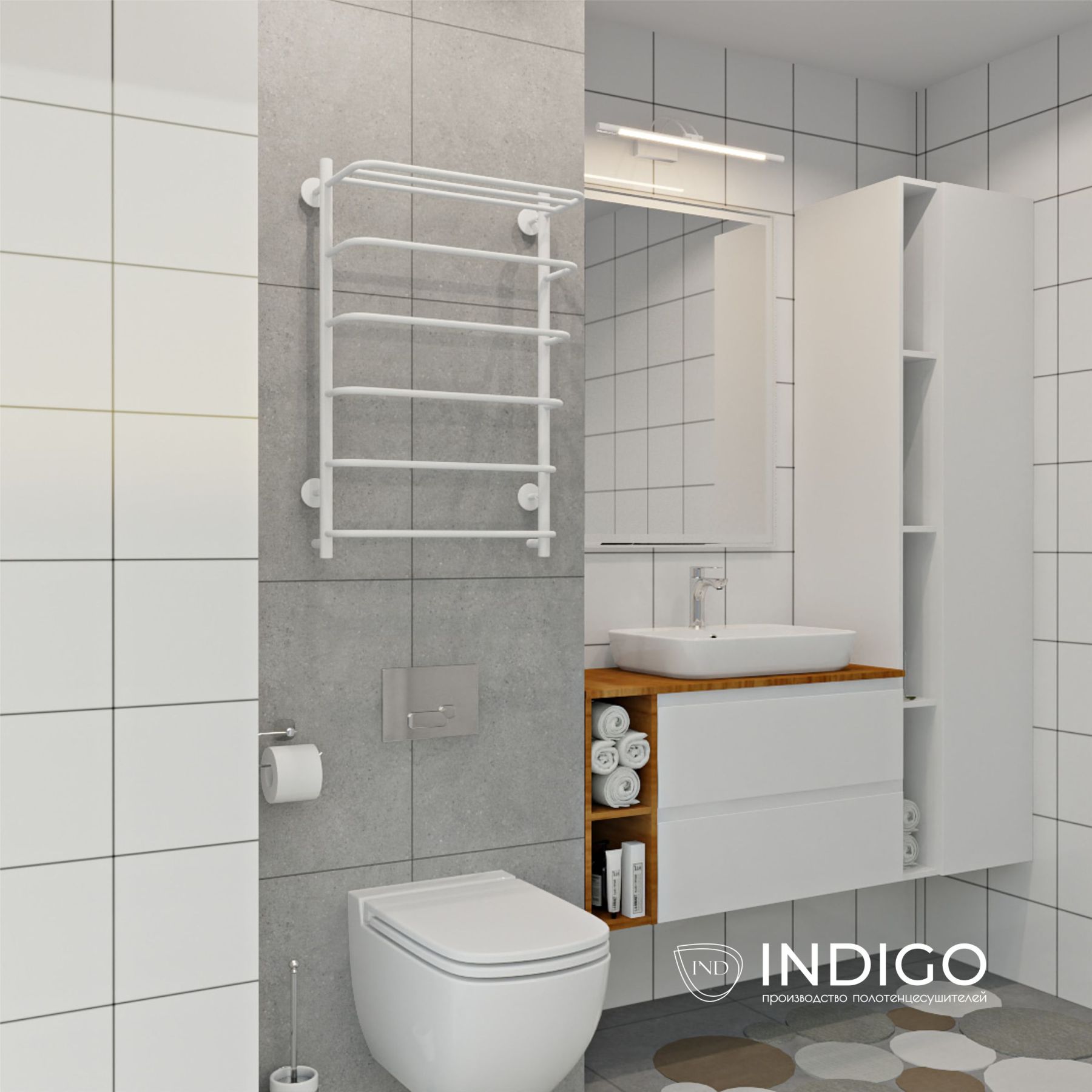 Полотенцесушитель электрический INDIGO в белом матовом оттенке. Пять перекладин и полка позволят... Подробнее
