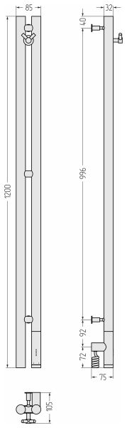 Полотенцесушитель имеет степень защиты IP54, что гарантирует безопасность использования в условиях повышенной влажности. Устройство поставляется со скрытым подключением и кабелем длиной 1,5 м, расположение блока управления и провода находится справа. Габариты прибора составляют 1200 мм в высоту и 85 мм в ширину, благодаря чему он хорошо впишется в пространство любой ванной комнаты.