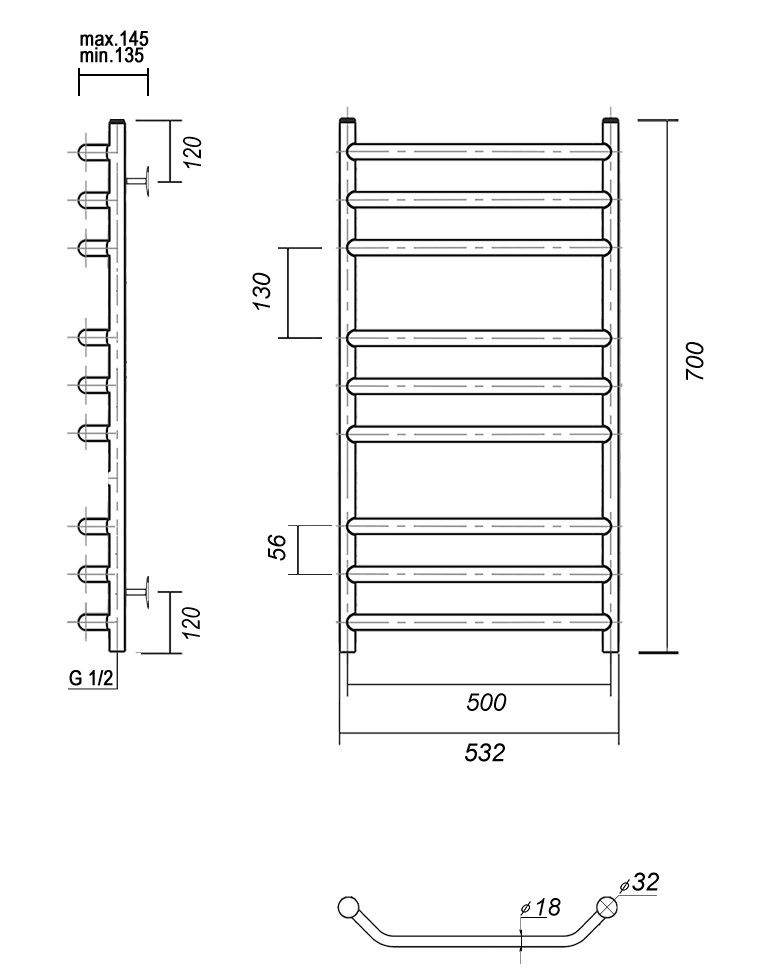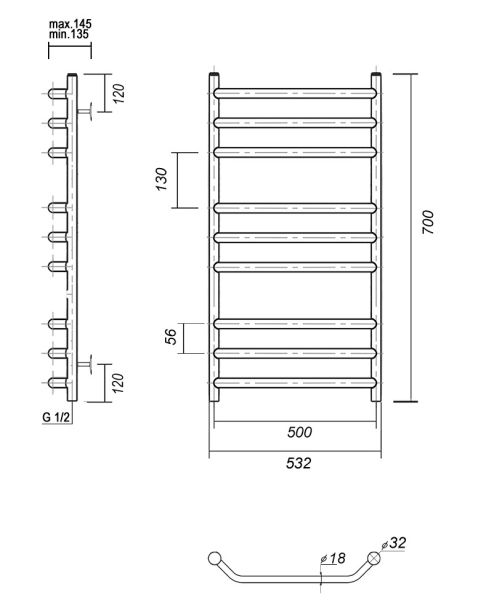 М/о расстояние (межосевое расстояние): 500Количество перекладин: 9Коллекция: ЛаураТип: водяныеЦвет: хромШирина (мм): 532Высота (мм): 700Глубина (мм): 145-135Вес: 5.63Объем: 0.062Страна: РоссияГарантия: 10 лет