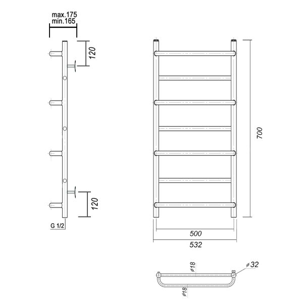 Полотенцесушитель водяной Domoterm Орфей П7, ширина 50 см высота 70 см, нижнее подключение, цвет золото, Орфей П7 500x700 золотоВодяной полотенцесушитель из нержавеющей пищевой стали. Труба электросварная. Толщина 2 мм. Вертикальные стойки имеют диаметр 32 мм., горизонтальные перекладины выполнены из трубы диаметром 18 мм. Подключение к ГВС нижнее, резьба внутренняя, 1/2"