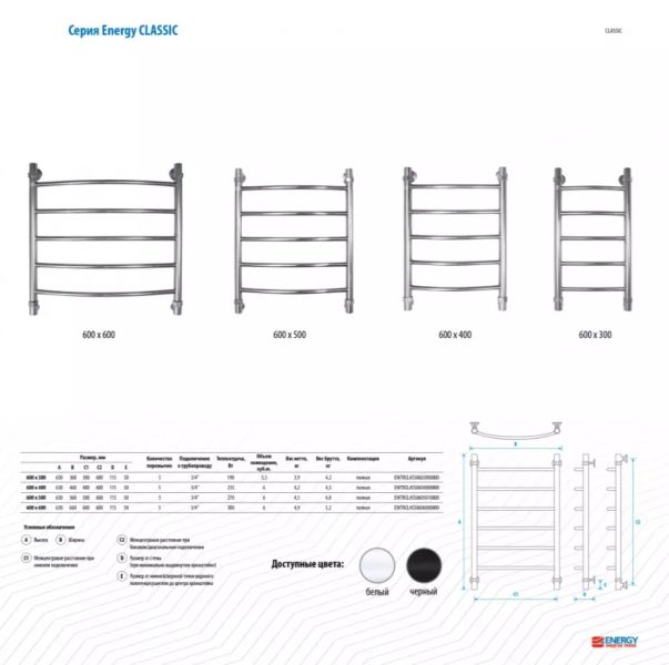 Полотенцесушитель водяной Energy Classic EWTRCLASS06040R903M 600 x 400 белый матовый купить