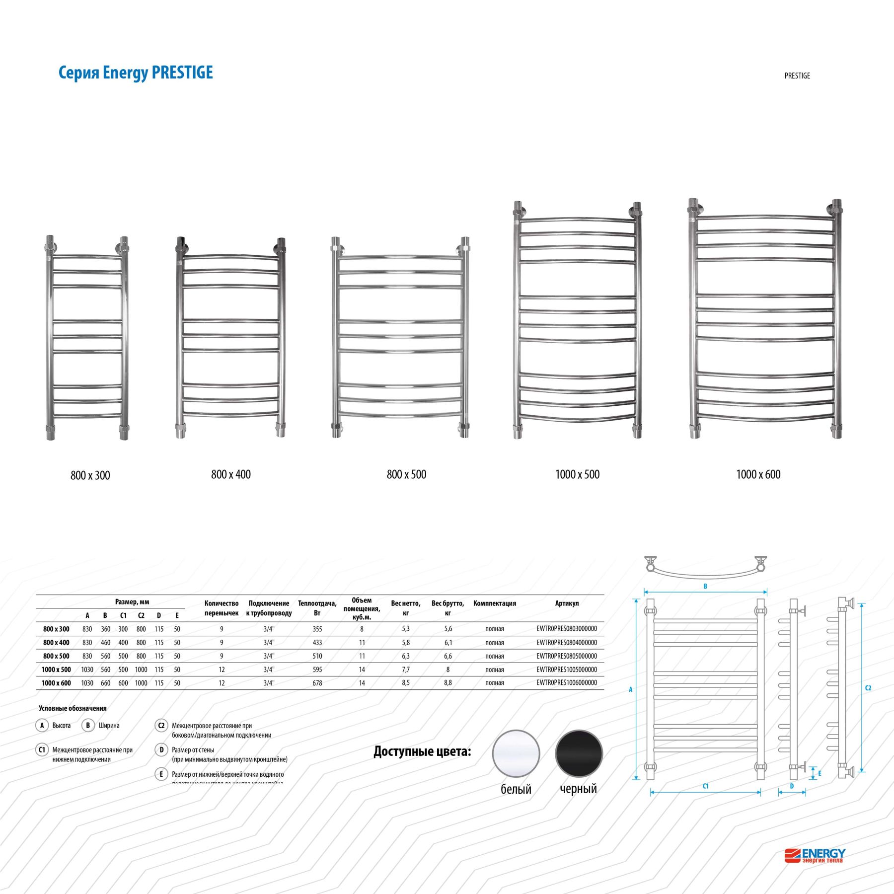 Утонченный и изысканный водяной полотенцесушитель Energy Prestige 800x500 RAL 9016 (белый матовый) типа «лесенка» c выпуклыми перемычками, размещёнными группами по высоте обогревательного прибора, и высокой теплоотдачей. Используется во всех системах горячего водоснабжения и отопления с рабочим давлением 3 - 15 атм при температуре теплоносителя до 105°С.Межцентровое расстояние: 800 мм (+/-5 мм) при боковом и диагональном подключении, 500 мм (+/-5 мм) при нижнем подключении.В комплектацию входят эксцентрики, позволяющие отрегулировать межцентровое расстояние.Полотенцесушитель изготовлен из высококачественной импортной пищевой нержавеющей стали марки AISI 304 (08Х18Н10). Поверхность изделия окрашена по технологии цветного порошкового напыления - достоинства этой технологии в том, что получаемые изделия прочны, долговечны и экологичны. Сварка швов выполнена по специальной технологии TIG по международному стандарту EN 10217-7. Полотенцесушитель испытан при давлении 50 атм, составляющая его труба — 150 атм, благодаря чему имеет большой запас прочности.Произведен в России. Гарантийный срок - 5 лет.