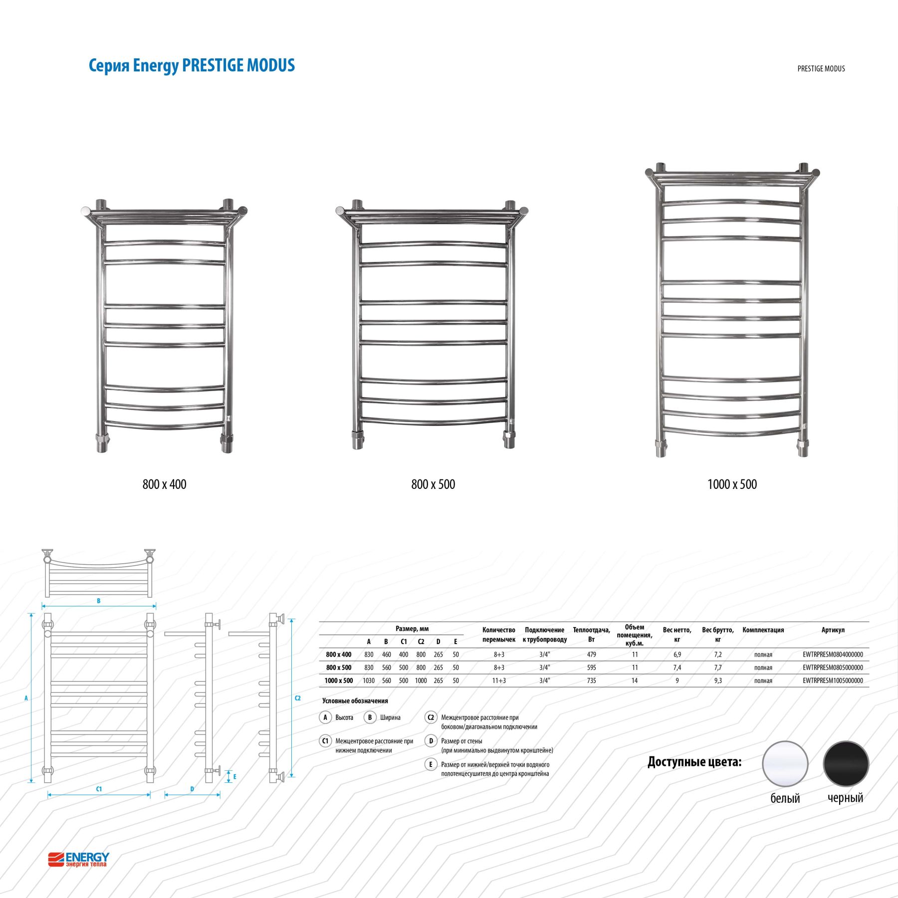 Водяной полотенцесушитель Energy Prestige Modus 800x500 RAL 9016 (белый матовый) - «лесенка c полкой» c выпуклыми перемычками, размещёнными группами. Дополнительная обогреваемая полка с 3 перекладинами увеличивает тепловую мощность и полезную площадь прибора, а также позволяет максимально удобно располагать на нем вещи для просушивания. Используется во всех системах горячего водоснабжения и отопления с рабочим давлением 3 - 15 атм при температуре теплоносителя до 105°С.Межцентровое расстояние: 800 мм (+/-5 мм) при боковом и диагональном подключении, 500 мм (+/-5 мм) при нижнем подключении.В комплектацию входят эксцентрики, позволяющие отрегулировать межцентровое расстояние.Полотенцесушитель изготовлен из высококачественной импортной пищевой нержавеющей стали марки AISI 304 (08Х18Н10). Поверхность изделия окрашена по технологии цветного порошкового напыления - достоинства этой технологии в том, что получаемые изделия прочны, долговечны и экологичны. Сварка швов выполнена по специальной технологии TIG по международному стандарту EN 10217-7. Полотенцесушитель испытан при давлении 50 атм, составляющая его труба — 150 атм, благодаря чему имеет большой запас прочности.Произведен в России. Гарантийный срок - 5 лет. Комплектуется всем необходимым для монтажа. Вся фурнитура производится итальянской фирмой Smart.Комплектация полотенцесушителя: