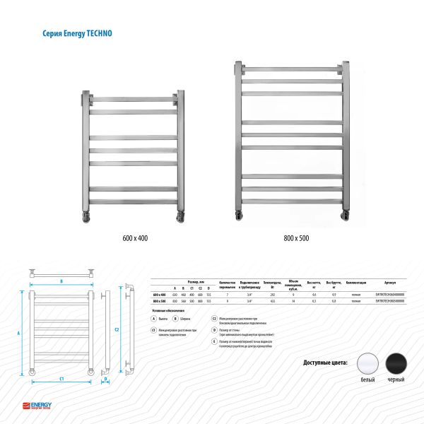 Полотенцесушитель водяной Energy Techno 600x400 RAL 9005 (черный матовый) - лесенка в современном стиле "техно" с необычными перемычками квадратного сечения, выполненная из нержавеющей стали. Используется во всех системах горячего водоснабжения и отопления с рабочим давлением 3 - 15 атм при температуре теплоносителя до 105°С.Межцентровое расстояние: 600 мм (+/-5 мм) при боковом и диагональном подключении, 400 мм (+/-5 мм) при нижнем подключении.В комплектацию входят эксцентрики, позволяющие отрегулировать межцентровое расстояние.Полотенцесушитель изготовлен из высококачественной импортной пищевой нержавеющей стали марки AISI 304 (08Х18Н10). Поверхность изделия окрашена по технологии цветного порошкового напыления - достоинства этой технологии в том, что получаемые изделия прочны, долговечны и экологичны. Сварка швов выполнена по специальной технологии TIG по международному стандарту EN 10217-7. Полотенцесушитель испытан при давлении 50 атм, составляющая его труба — 150 атм, благодаря чему имеет большой запас прочности.Произведен в России. Гарантийный срок - 5 лет.