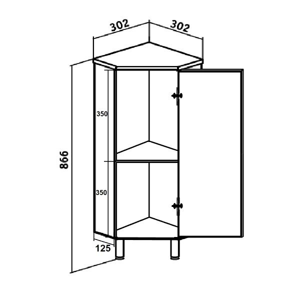 Тумба в ванную (полупенал) угловая с распашной дверью, за которой одна встроенная полка. Петли со встроенным доводчиком, ручка - 1шт, ножки хром - 2 шт, ножки пластик -1шт. Выпускается только в правом исполнении.