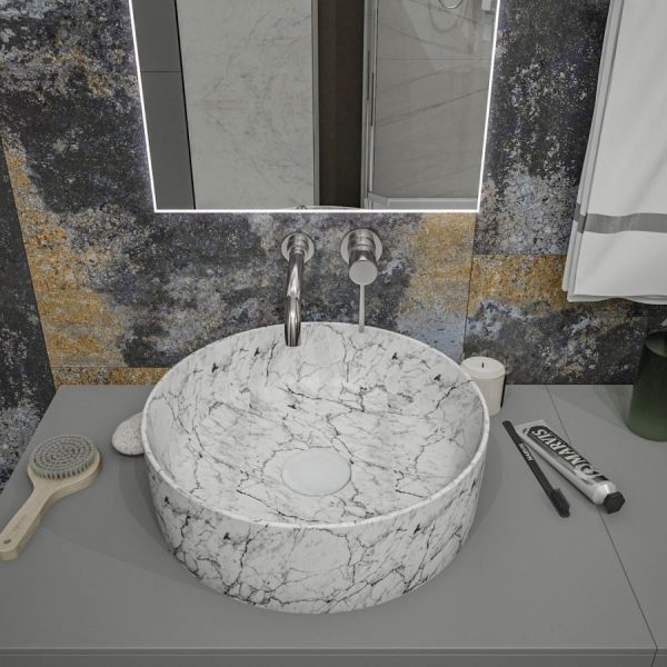 Раковина чаша Maretti EA13NS10-740MR, белый мрамор. Материал: санфарфор. Размер: 41x41x14. Форма: круглая.Преимущества:- гарантия на изделие – 10 лет;- произведён из санфарфора высшего качества;- антибактериальное водоотталкивающее покрытие чаши;- материал не выцветает со временем и не теряет потребительских свойств;- санфарфор надёжен, устойчив к появлению сколов и царапин.