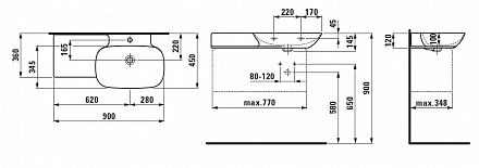 Особенности: 1 отверстие для смесителя по центру, без крепежей, с переливом, столешница слева