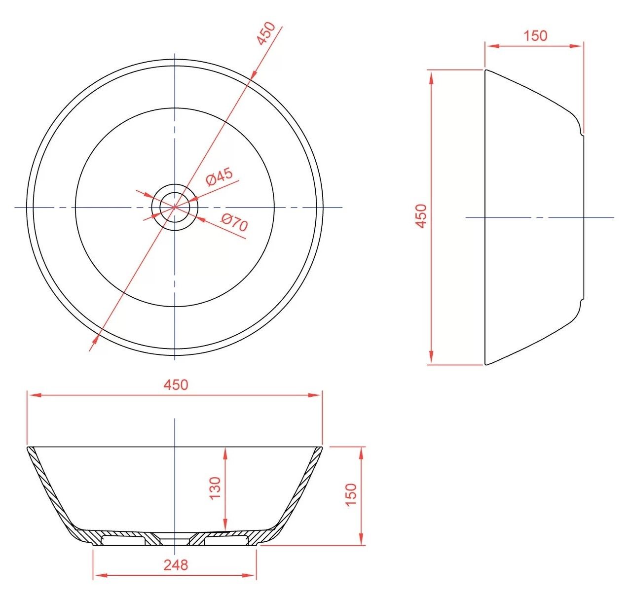 Раковина из искусственного камня для ванной комнаты круглой формы.Довольно крупная и удобная в использовании, с чашей глубиной внушительные 210 мм. Тонкий бортик придает модели Piemont 450 элегантности и легкости. Небольшой подиум отделяет чашу от поверхности, на которую установлена раковина, тем самым возвышая и подчеркивая контуры самой чаши. Piemont 450 имеет матовую, бархатистую поверхность. Полимерный материал принимает температуру окружающей среды, поэтому в жилом пространстве данная модель раковины всегда будет приятной на ощупь.Данная модель устанавливается на поверхность столешницы или мебели накладным способом сверху. Чаша обладает большей глубиной, чем многие накладные раковины бренда Montebianco.Уход за раковиной из искусственного камня прост: в большинстве случаев достаточно протереть поверхность влажной губкой с чистящим средством. Материал не впитывает влагу, не порист, непроницаем для плесени, бактерий и грибков.