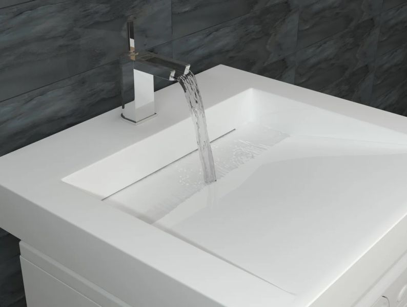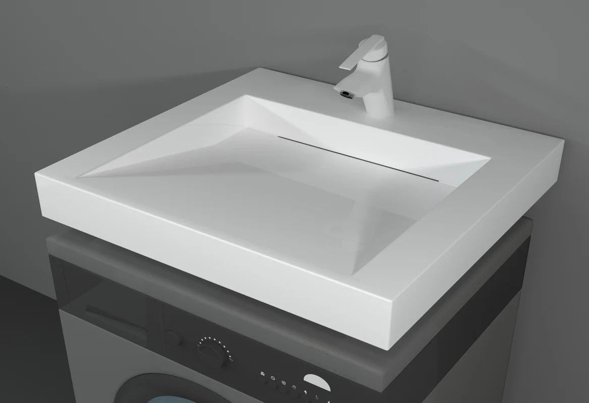 Ультрасовременная раковина в ванную комнату для установки над стиральной машинкой с щелевым сливом. Крепится на кронштейны, которые входят в комплект поставки. Верхний слой высококачественного гелькоута образует декоративно-защитное покрытие.