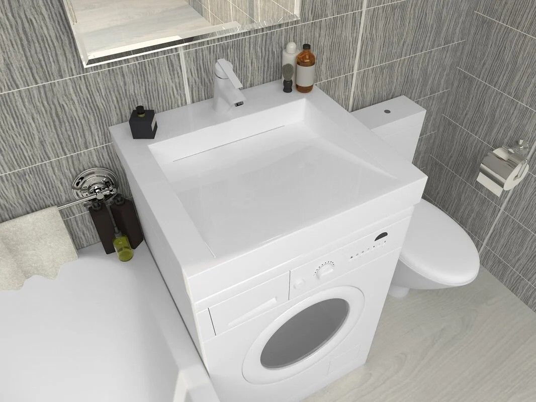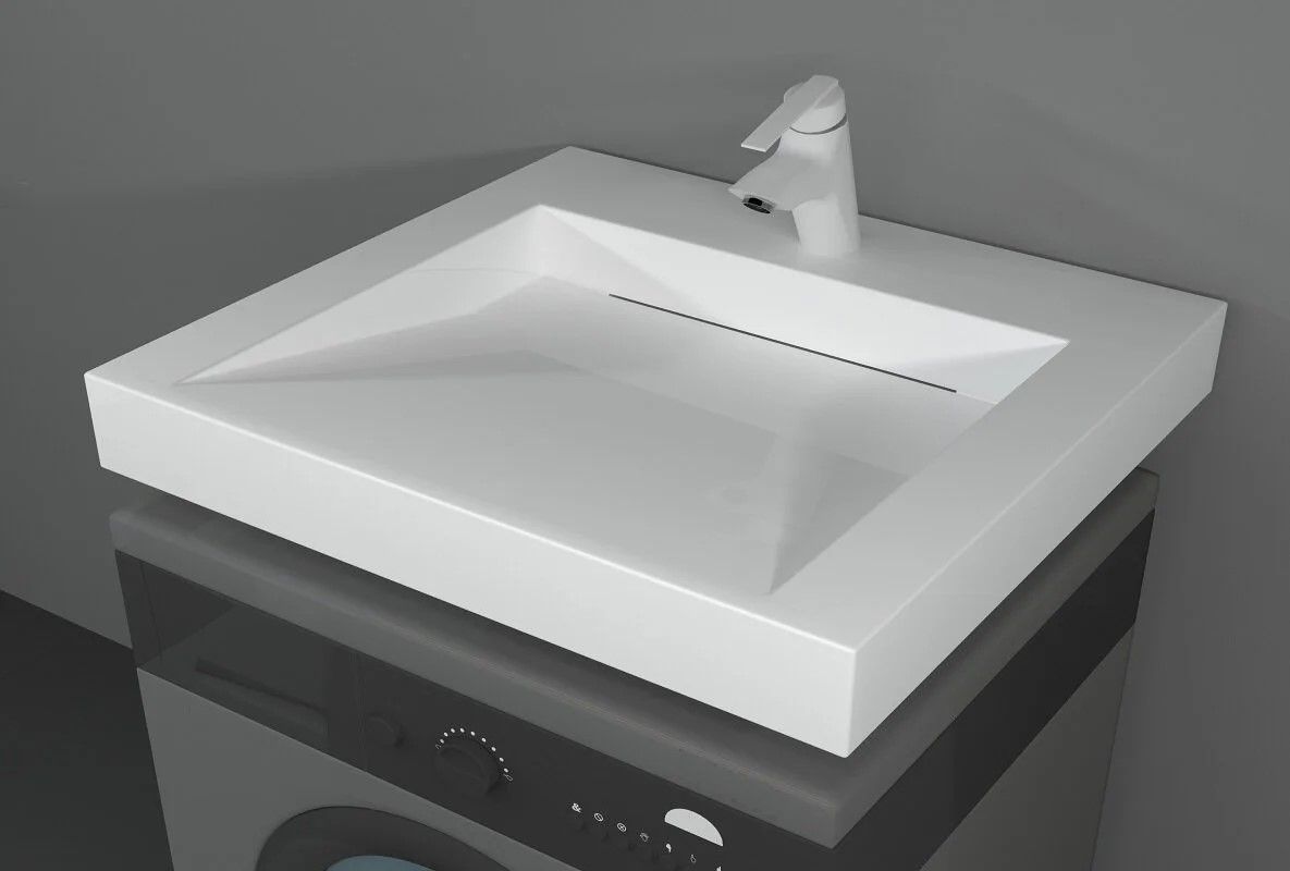 Ультрасовременная раковина в ванную комнату для установки над стиральной машинкой с щелевым сливом. Крепится на кронштейны, которые входят в комплект поставки. Верхний слой высококачественного гелькоута образует декоративно-защитное покрытие.