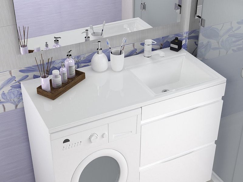 Раковина для ванной комнаты для установки над стиральной машинкой. Верхний слой гелькоута формирует декоративно защитное покрытие. Раковина крепится на кронштейны. Может эксплуатироваться как самостоятельное изделие, так и со встроенной мебелью.