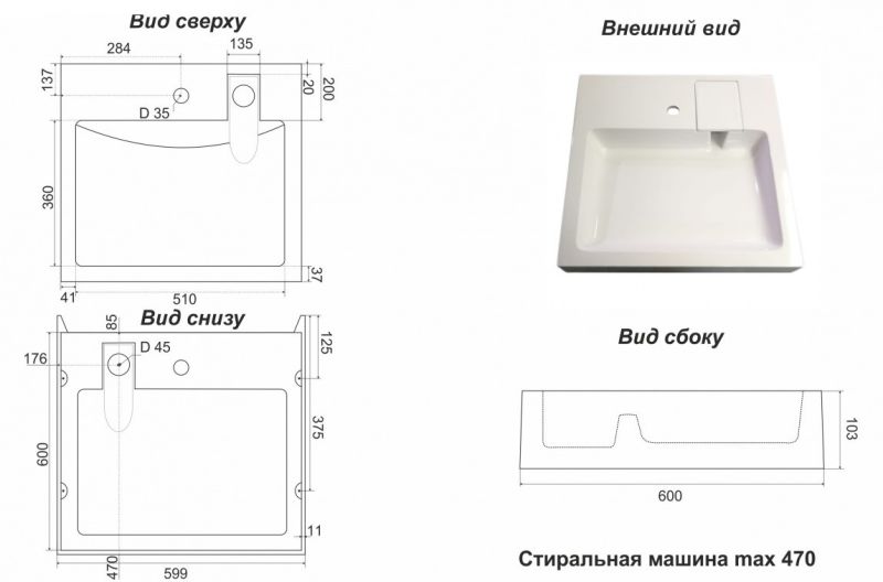 Раковина в ванную комнату для установки над стиральной машинкой. Крепится на кронштейны, которые входят в комплект поставки. Верхний слой высококачественного гелькоута образует декоративно-защитное покрытие.Основные характеристики: