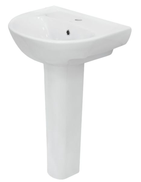 Лаконичный пьедестальный умывальник ЭТАЛОН имеет базовый размер, полочку и большую глубокую чашу
