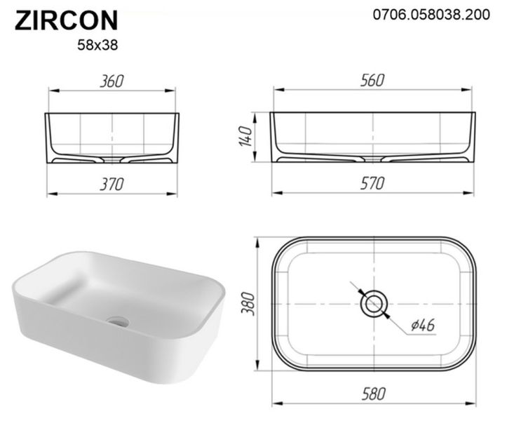 Раковина Whitecross Zircon 0706.058038.200 58см белый матовый