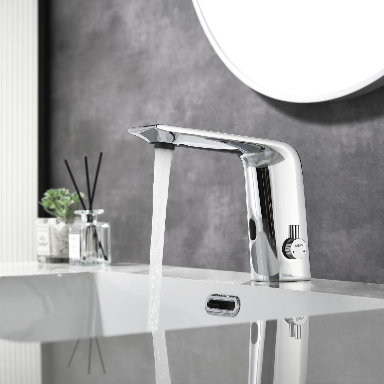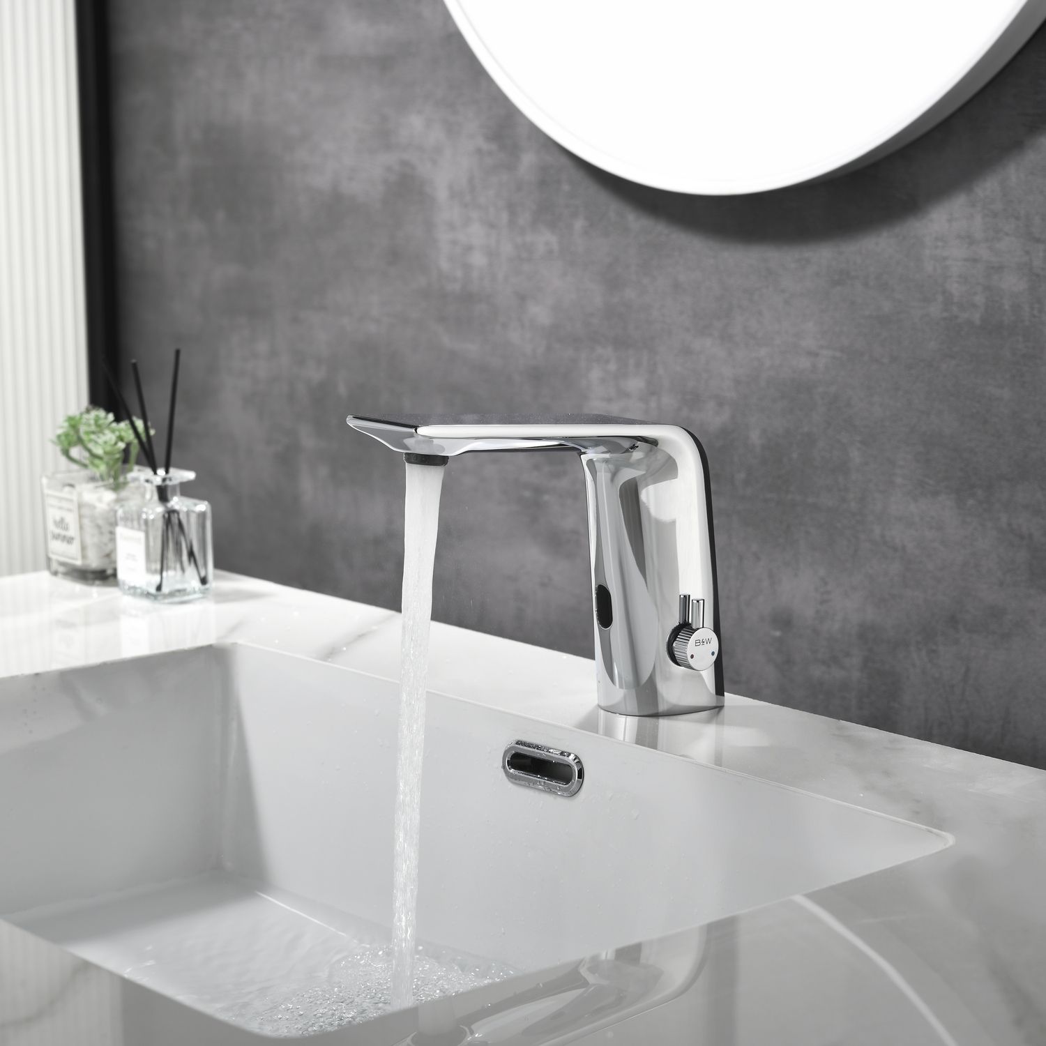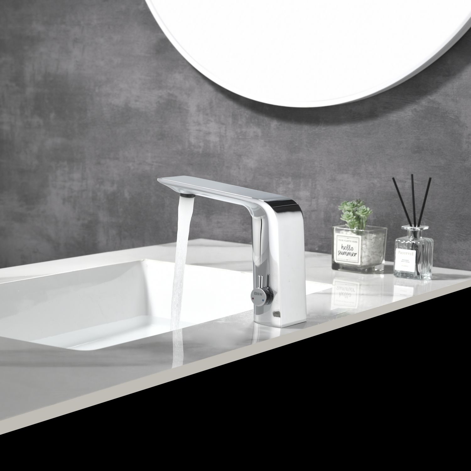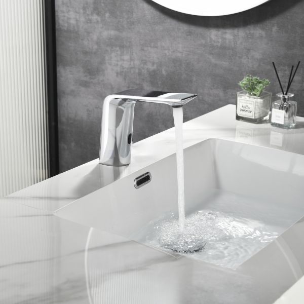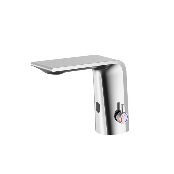 Смеситель для раковины датского производителя Black&White. Изделие изготовлено из сантехнической латуни – данный материал безопасен для здоровья и выдерживает высокое давление. Сверху корпус покрыт хромоникелевым покрытием, которое не корродирует.  Открытие воды происходит с помощью инфракрасного датчика, который работает на аккумуляторе постоянного тока. Данное решение гигиенично и экономит воду, особенно в общественных помещениях. Настройка температуры вынесена на ручку расположенную справа от снования. Комбинация округлого основания и плоского излива гармонично вольется в современные интерьеры ванной комнаты.