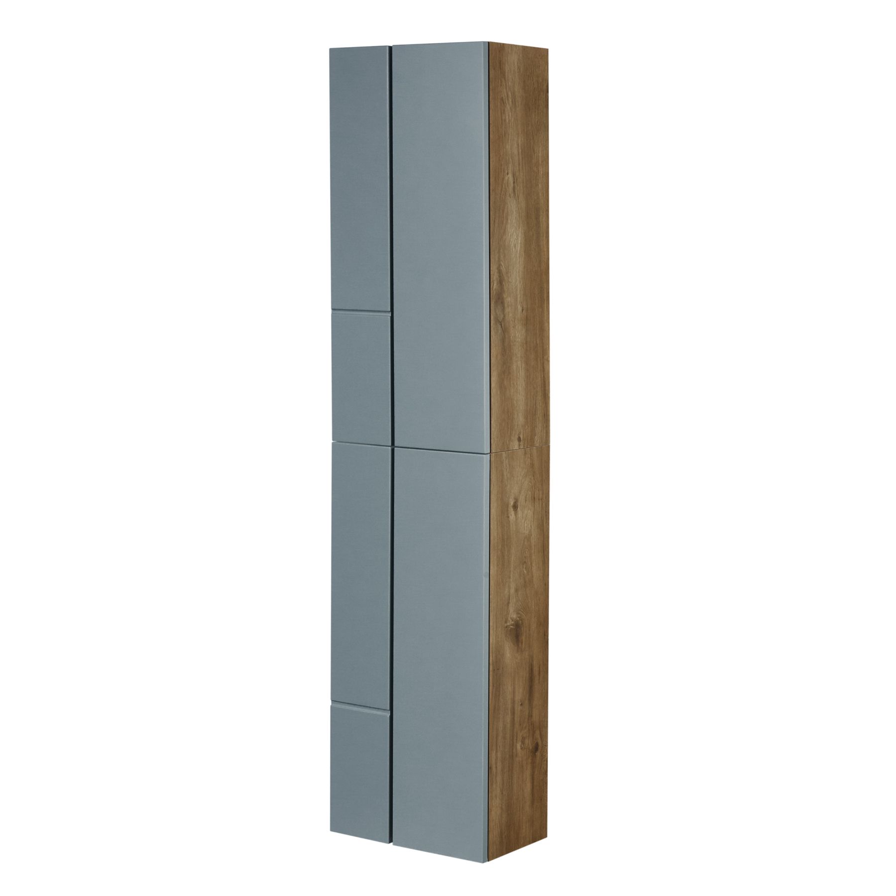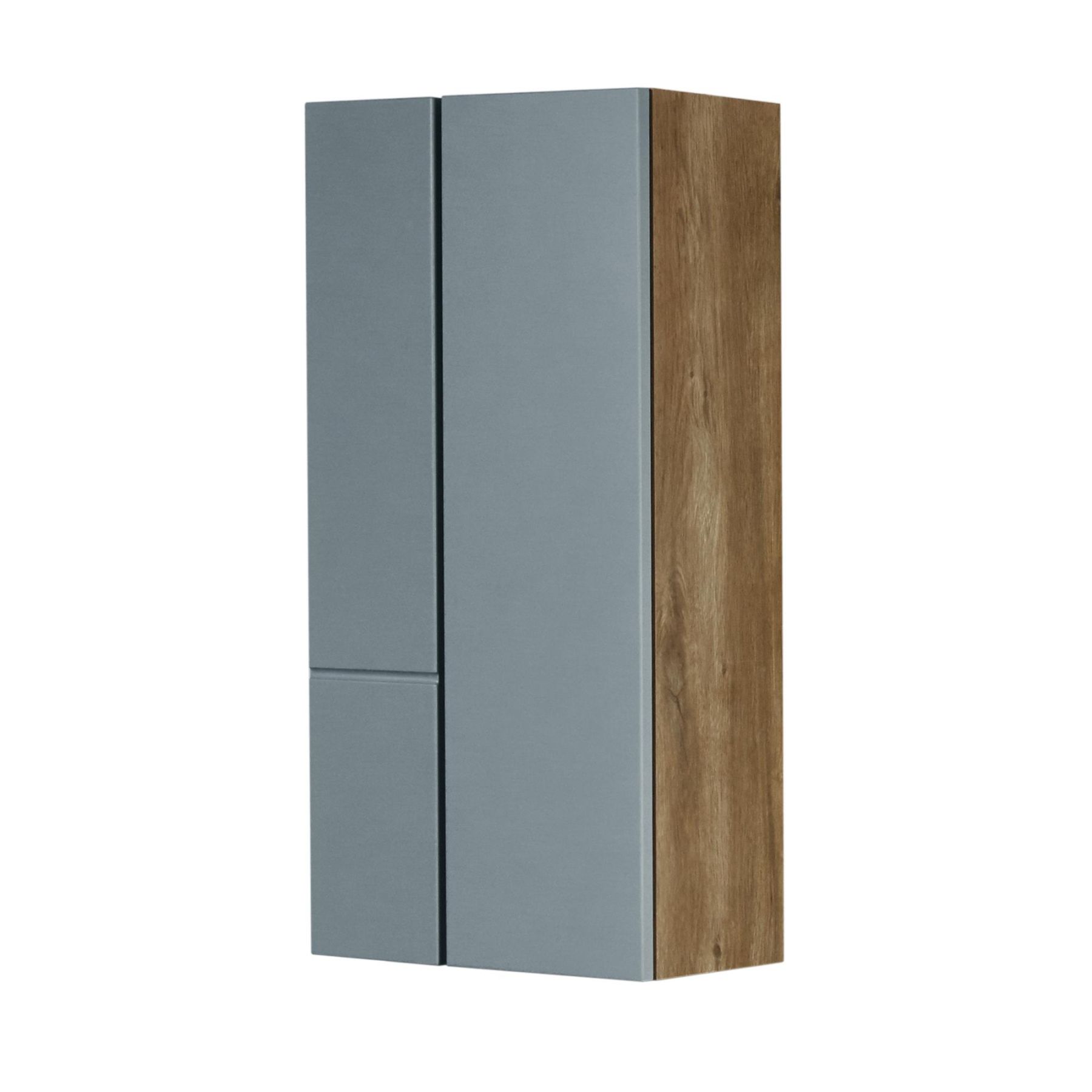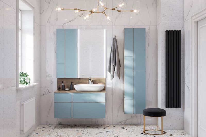 • Дизайн шкафчика повторяет тумбу-умывальник: фасады в матовой пленке фьерд сочетаются с корпусом в декоре дуб рустикальный