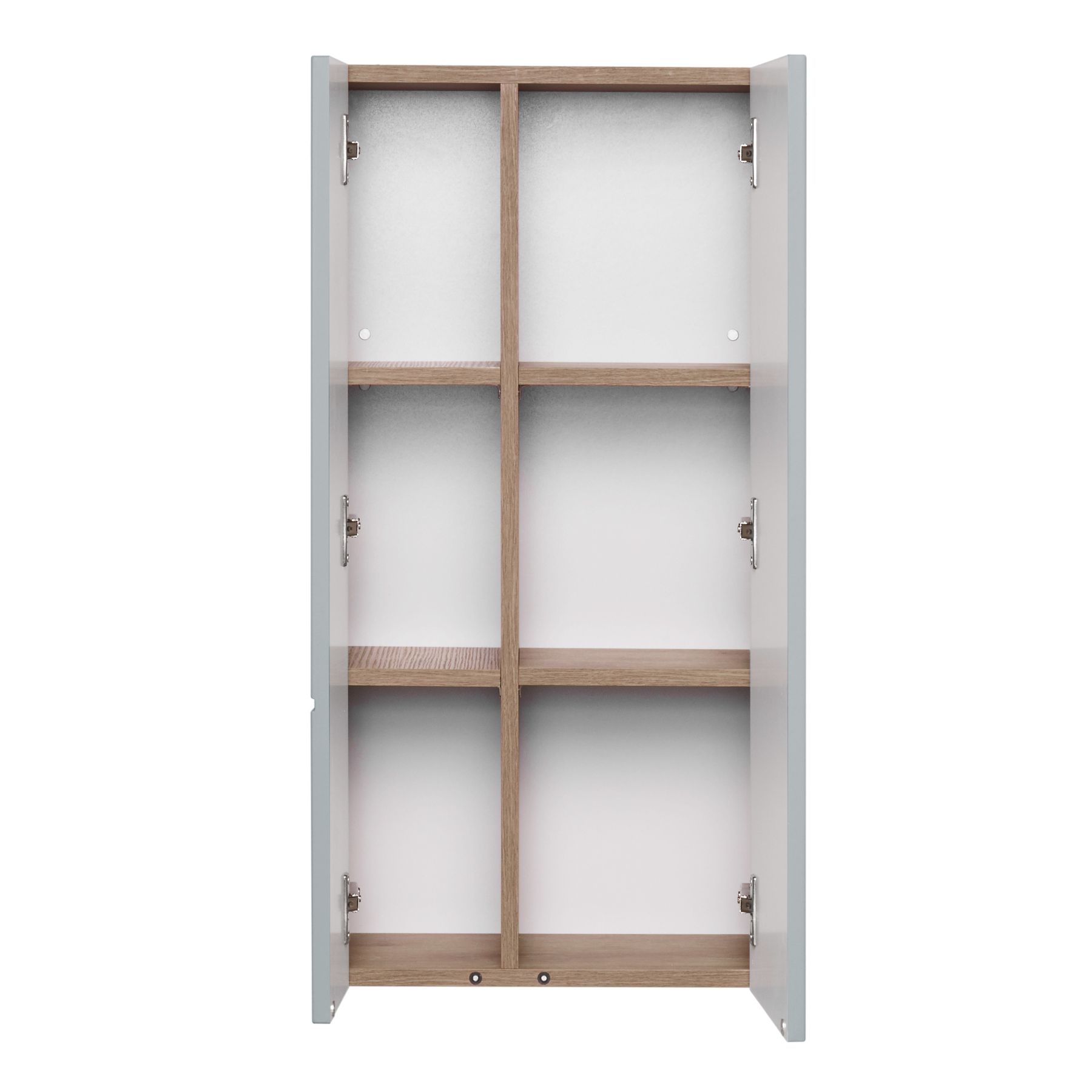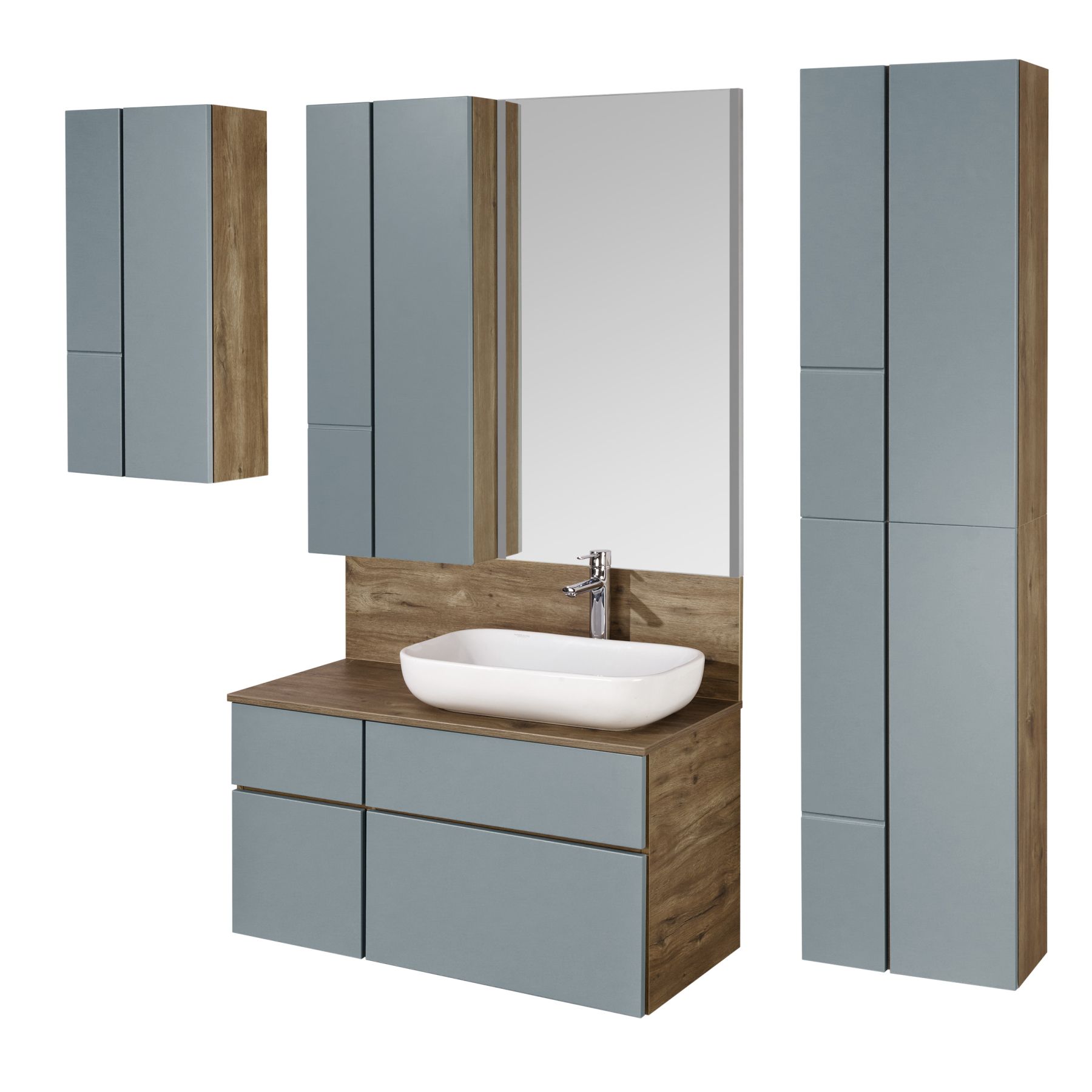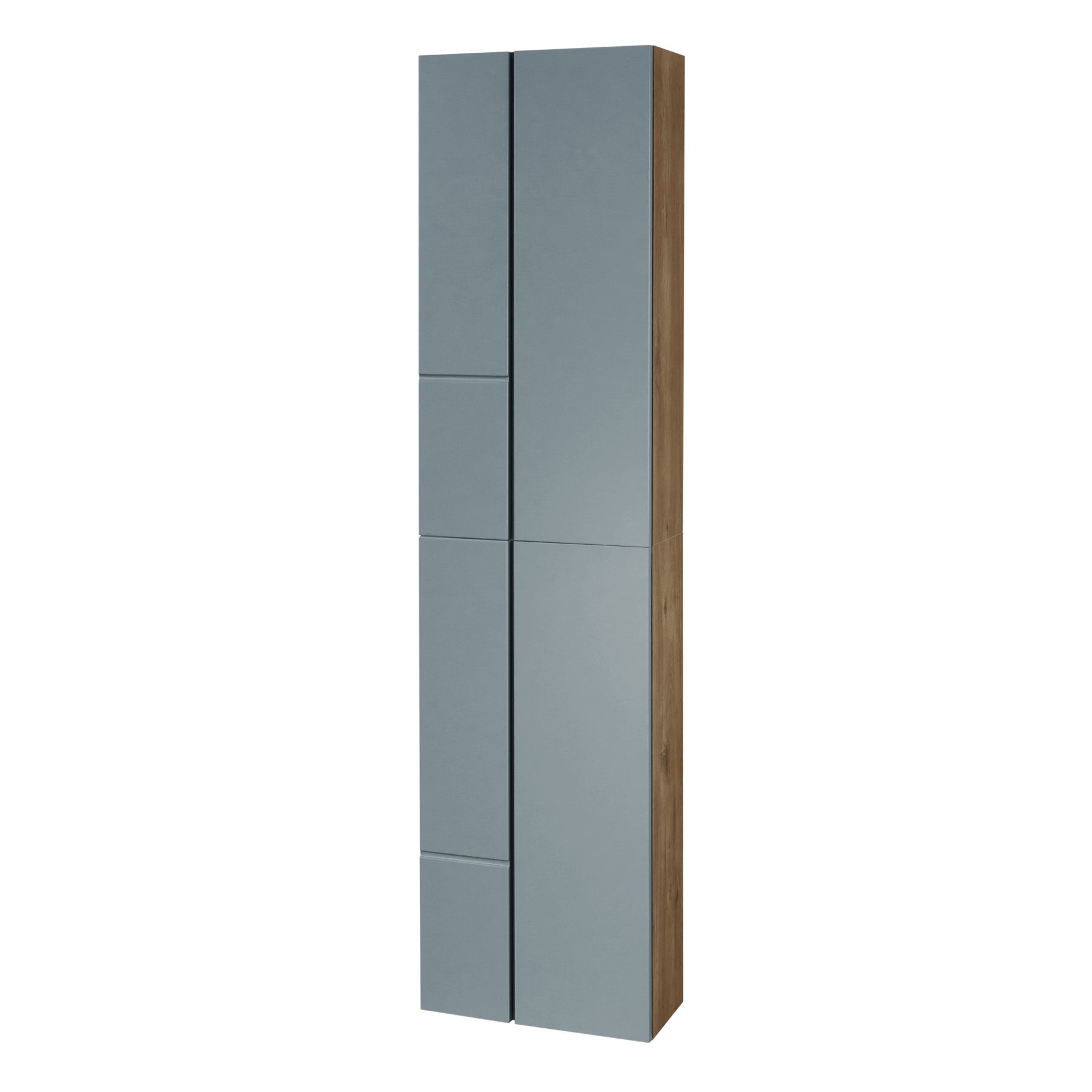 • Дизайн шкафчика повторяет тумбу-умывальник: фасады в матовой пленке фьерд сочетаются с корпусом в декоре дуб рустикальный