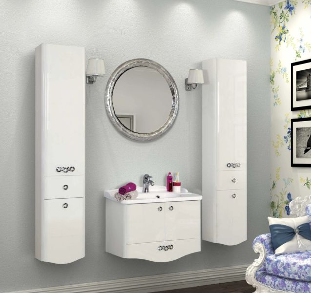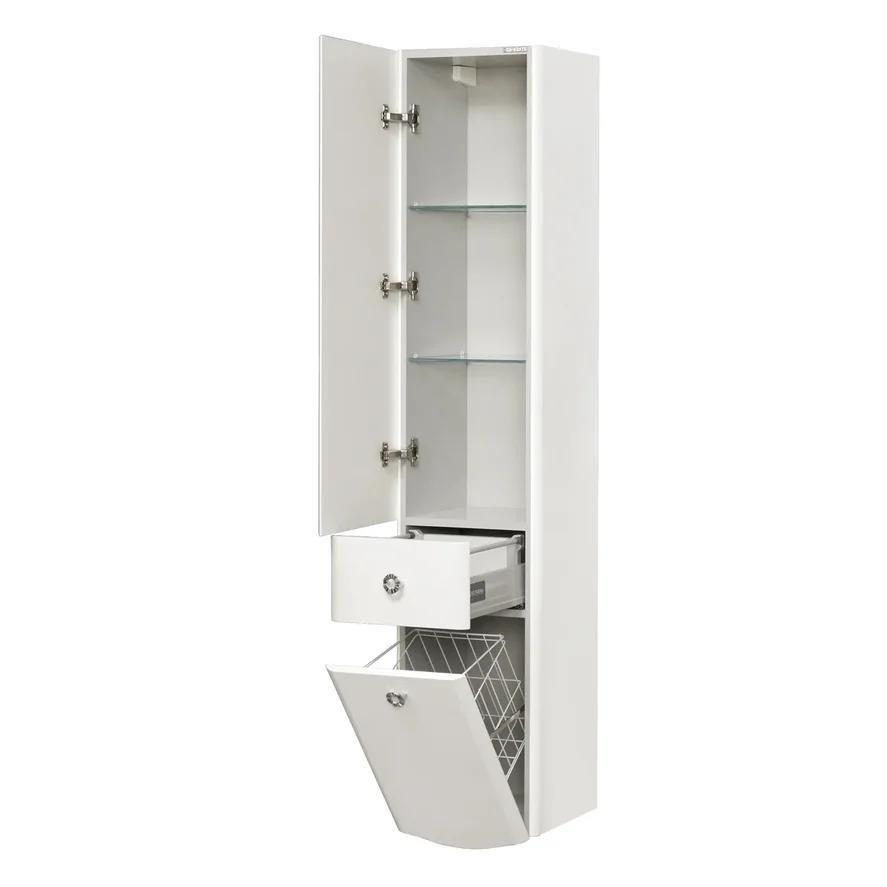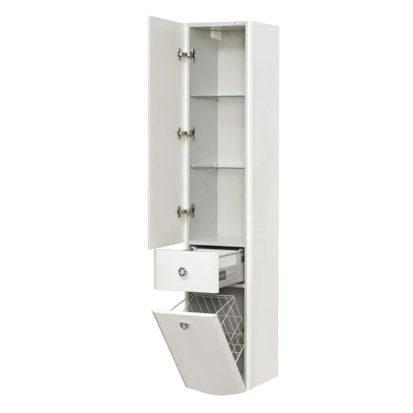 Изящный подвесной шкаф-колонна выполнен в популярном сегодня неоклассическом стиле из влагостойкой ламинированной плиты и высококачественной МДФ, окрашен в белый цвет с высокой степенью глянца полиэфирной краской ультрафиолетового отверждения. Внутреннее наполнение изделия имеет серый цвет. За верхним фасадом с декоративной ручкой расположены регулируемые по высоте стеклянные полки, на которых можно разместить все необходимые в ванной комнате принадлежности. Двустенный ящик полного открывания идеально подойдет для мелочей. Также шкаф оборудован корзиной для белья-функциональной деталью, незаменимой в ванной комнате. Петли данного шкафа-колонны, расположенные слева, оснащены специальными доводчиками, что обеспечивает мягкое и бесшумное закрывание.