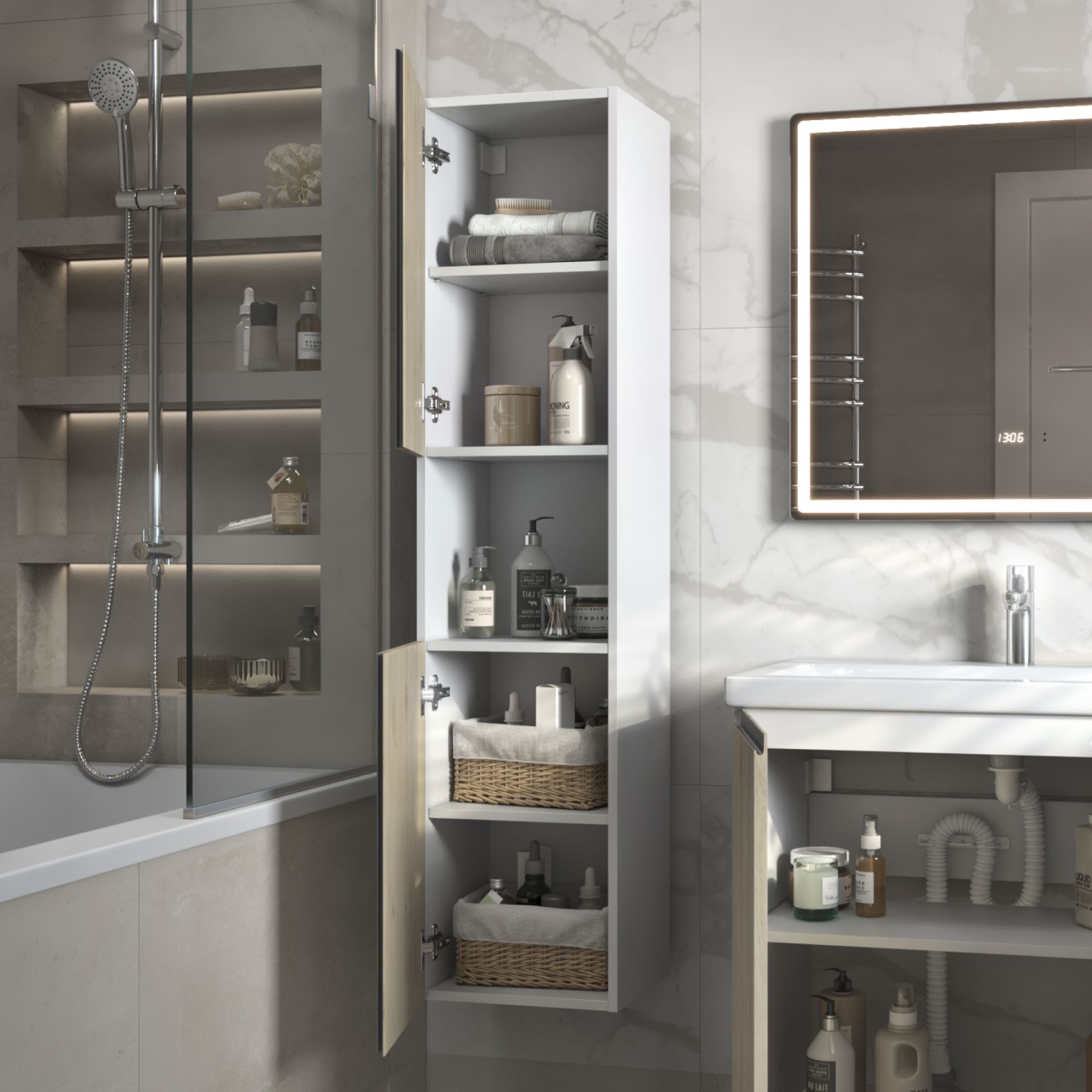 Шкаф-пенал VIGO Yuma 35 подвесной 345 дуб давос. Комплектация: корпус, 2 дверцы, петли с механизмом доводчика, 4 полки ЛДСП. Поставляется в разобранном виде.
