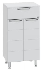 Компактные габариты позволяют грамотно организовать небольшой санузел, а пространство за распашными дверцами с механизмом плавного закрывания поможет разместить все необходимые вещи.