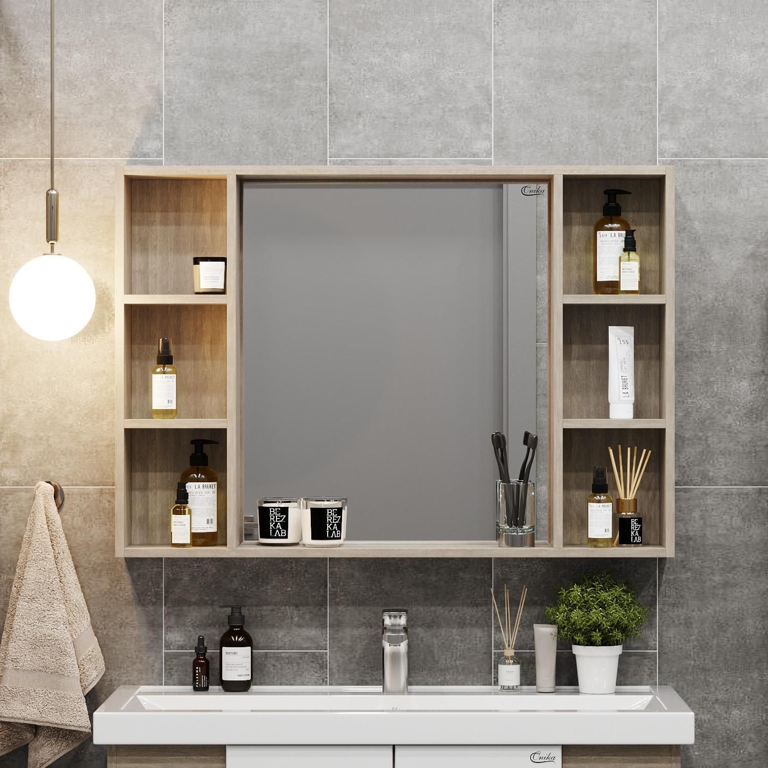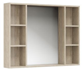 6 открытых полок по бокам от зеркала обеспечивают быстрый доступ к часто используемым аксессуарам, место под зеркалом создано для косметических средств или декоративных элементов.