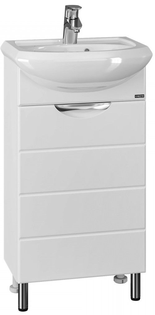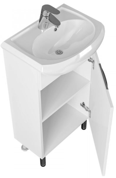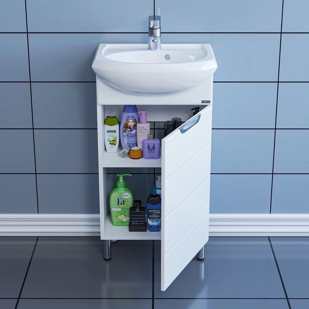 Несмотря на небольшие размеры, шкаф достойно выполнит задачу по хранению: пространство за распашной дверцей с механизмом плавного закрывания позволяет разместить необходимые мелочи, а открытые полки можно использовать для декора или часто используемых предметов.