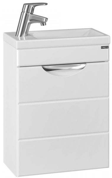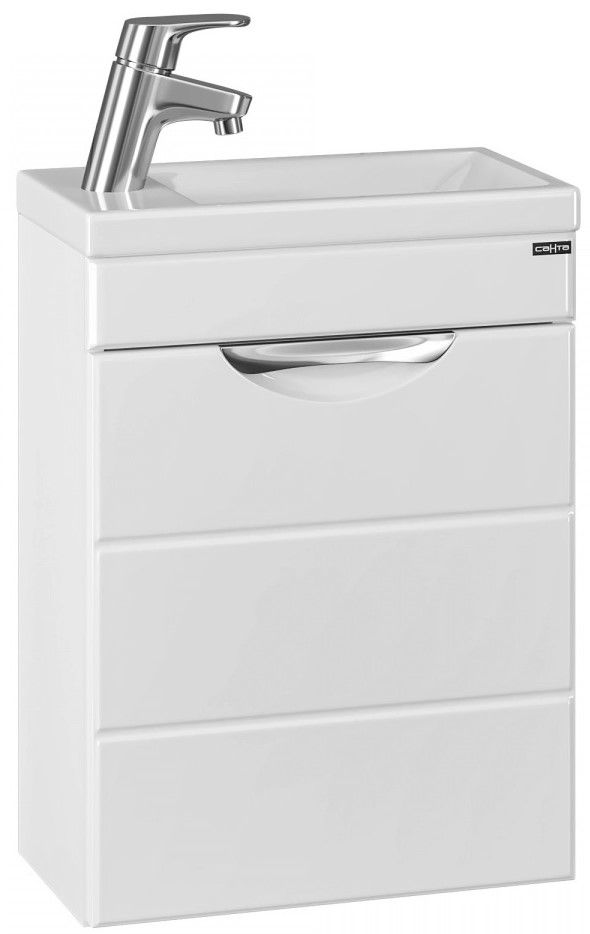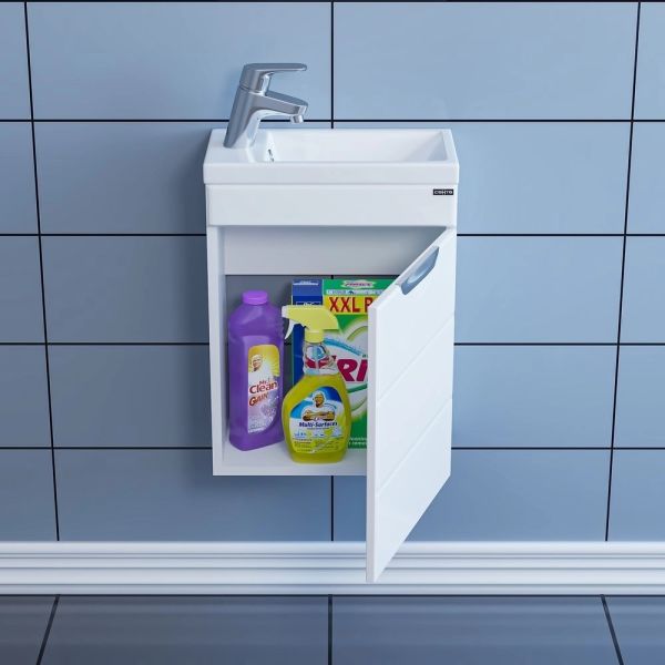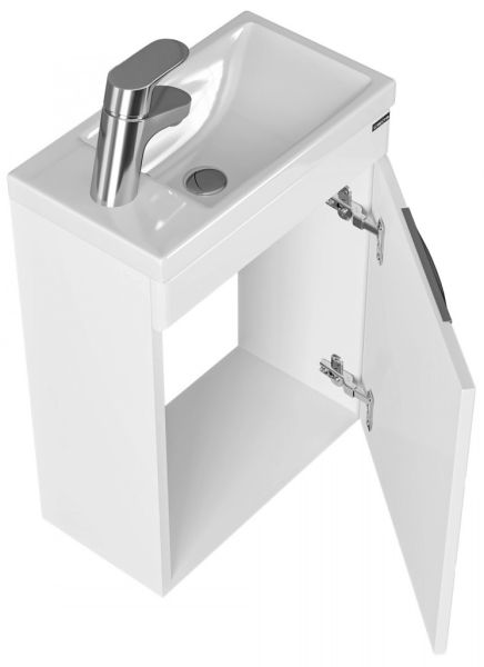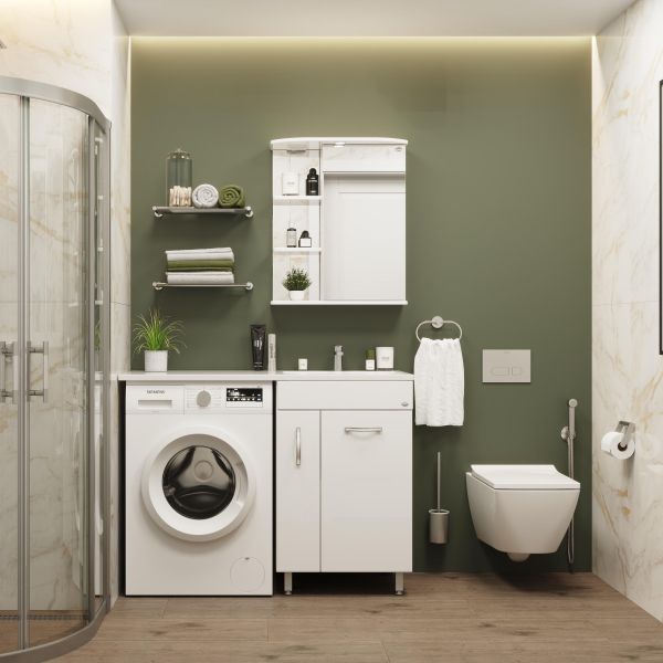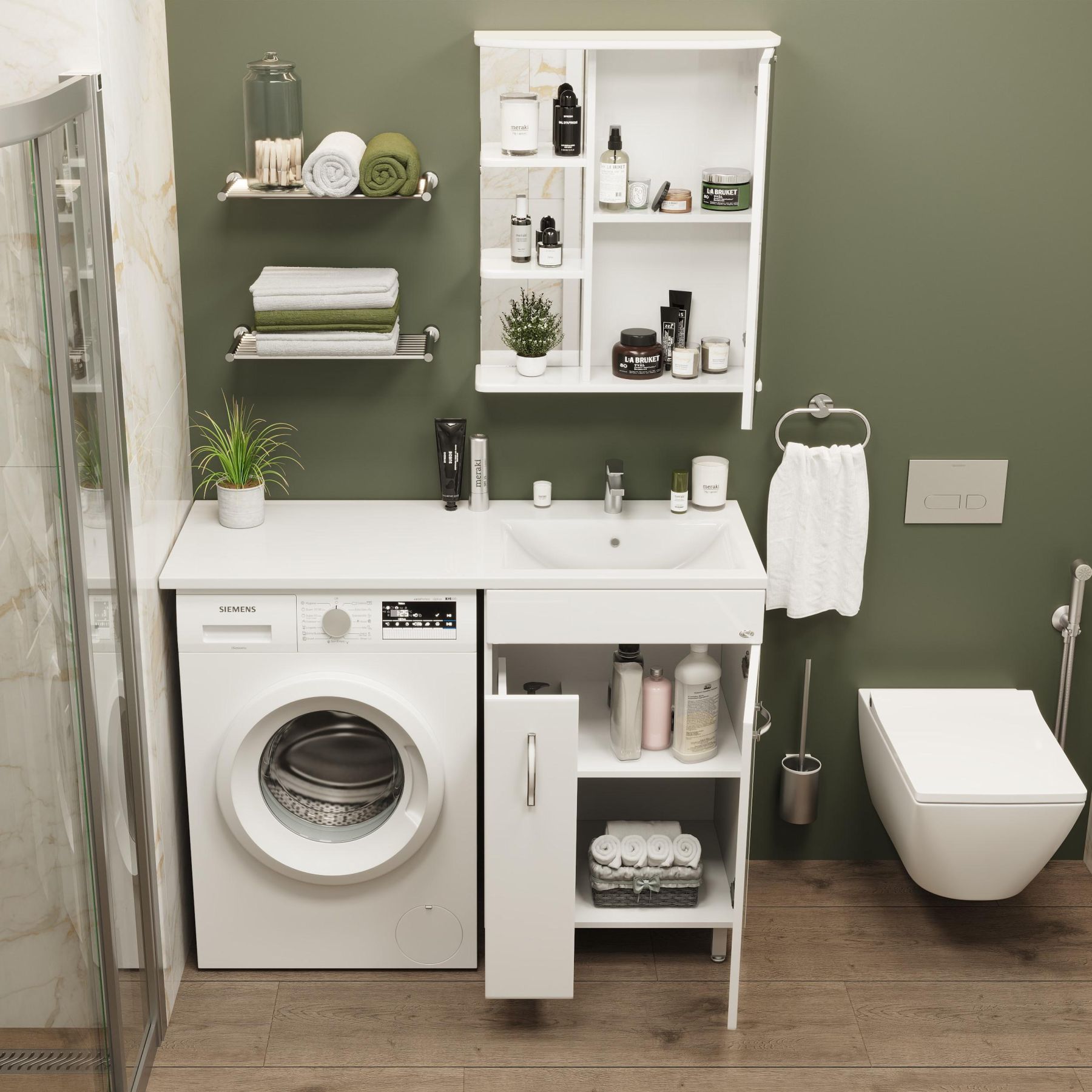 Открытые полочки слева обеспечивают быстрый доступ к часто используемым аксессуарам, а пространство за распашной зеркальной дверцей с механизмом плавного закрывания, разделенное двумя полочками, станет удобным местом для хранения различных бытовых принадлежностей.