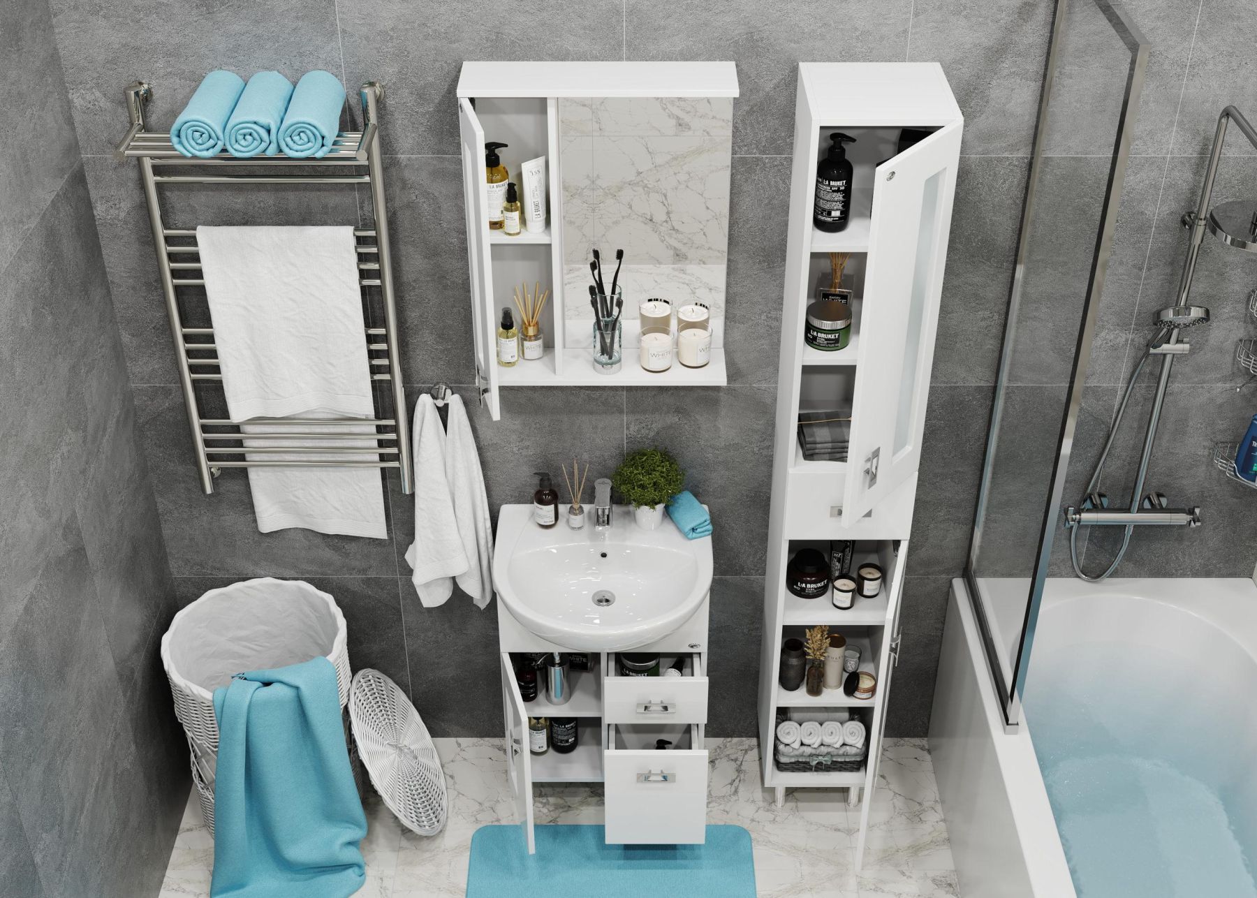 Белоснежный цвет фасада в сочетании со вставками из матового стекла и хромированными ручками необычной формы придадут ванной комнате ощущение свежести, чистоты и уюта.