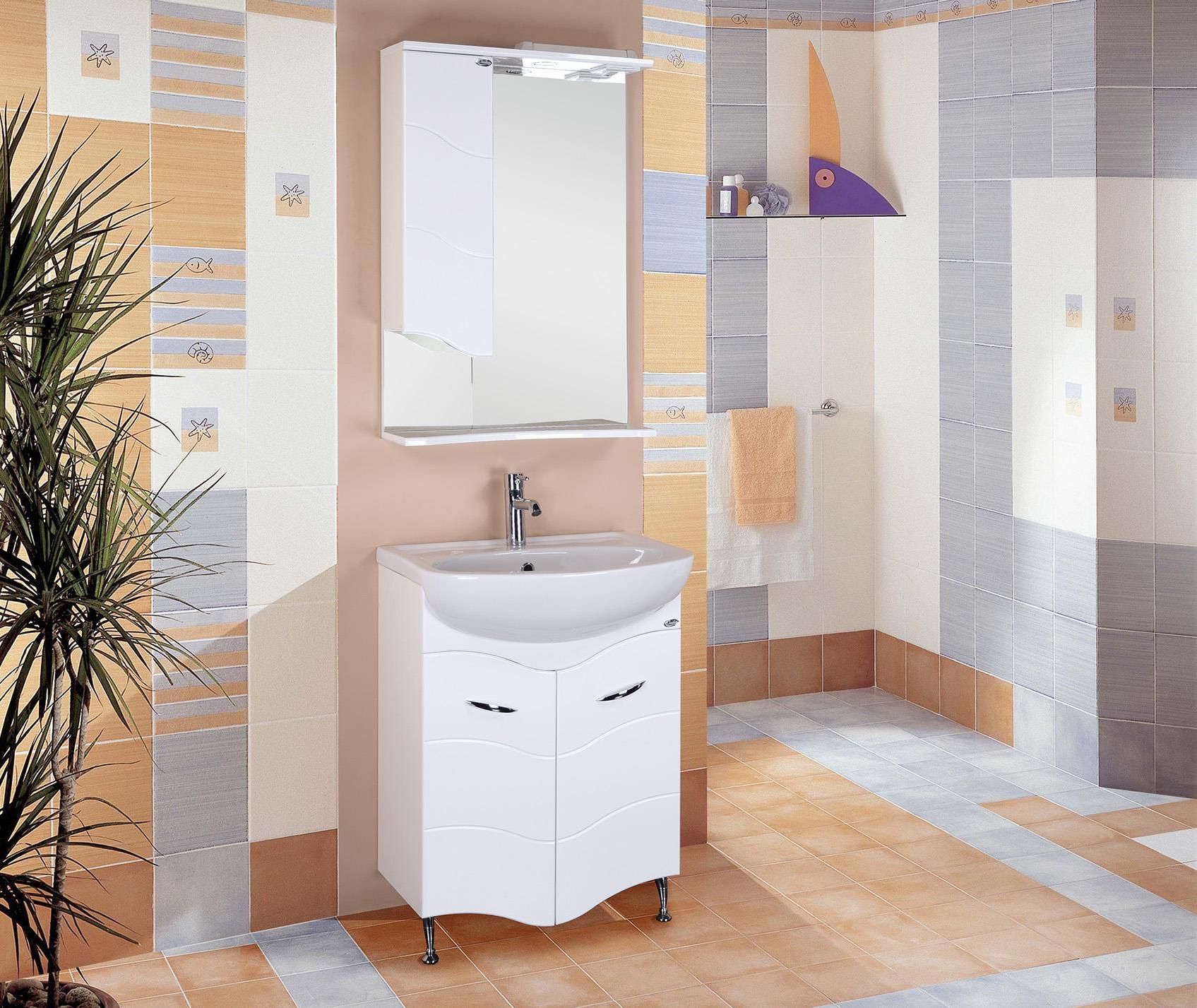 Слева от зеркала за распашной фигурной дверцей с изящной фрезеровкой и механизмом плавного закрывания расположено отделение для хранения, разделенное на две части горизонтальной полочкой, под зеркалом - открытая полочка для косметических средств или декоративных элементов.