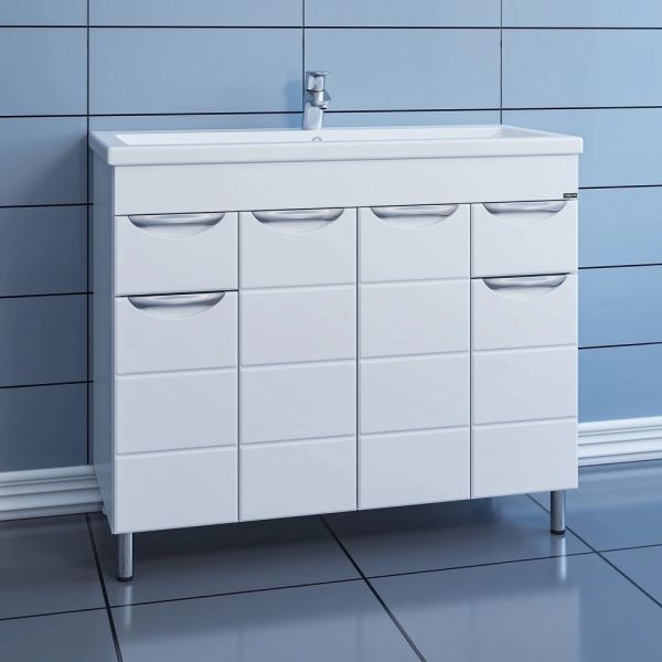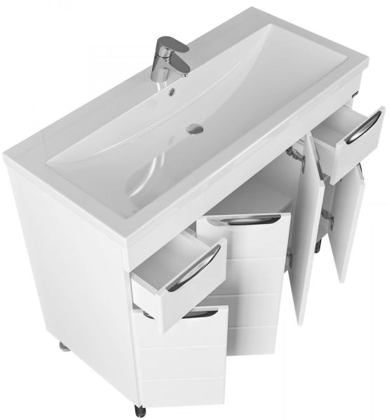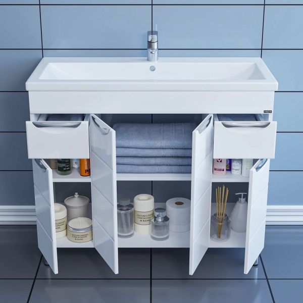 Справа от зеркала за распашной дверцей с механизмом плавного закрывания расположено отделение для хранения, под зеркалом - открытая полочка для косметических средств или декоративных элементов.