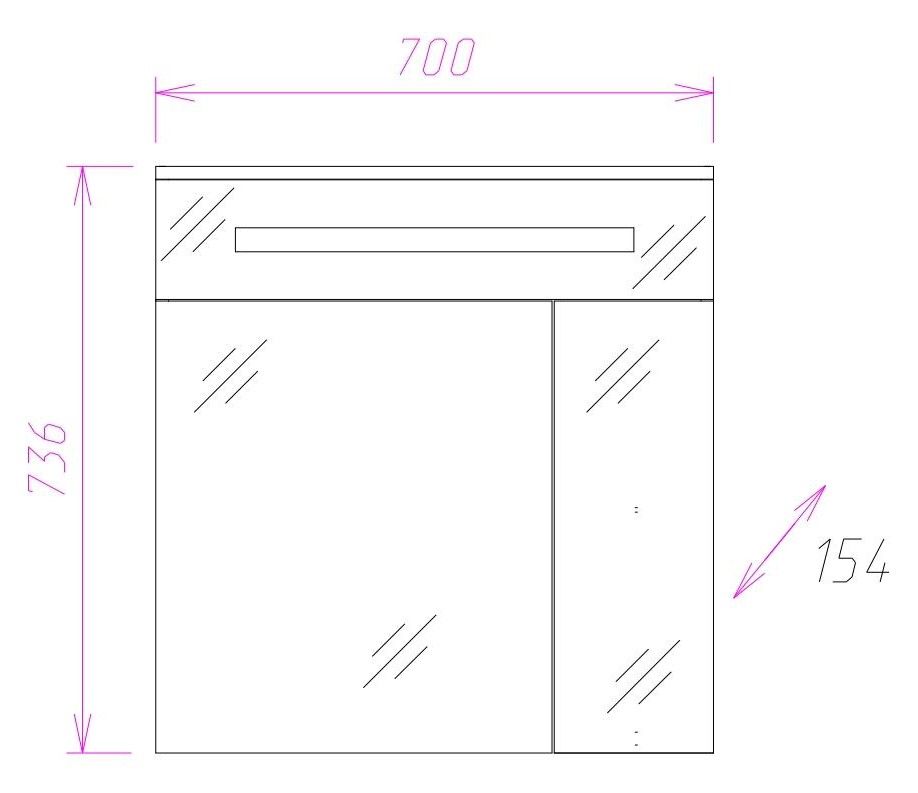 Внешне это отражается в лаконичной прямоугольной форме без ручек и лишнего декора и стильной подсветке, в функционально - в двух дверцах разного размера с механизмом плавного закрывания, скрывающих просторное пространство для хранения необходимых вещей, разделенное на 2 части стеклянной полочкой с еврокромкой.