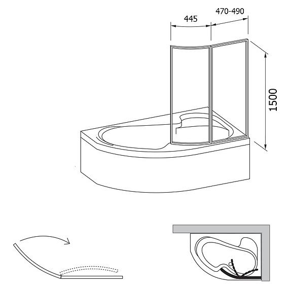 Шторка для ванны двухэлементная поворотная, с закруглением Ravak VSK2 Rosa 150 правая, белый профиль, прозрачный полистирол 76P8010041