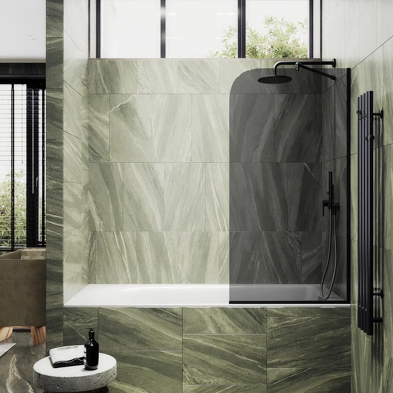 Монтаж осуществляется с помощью алюминиевого профиля, что обеспечивает надежность крепления и безопасность использования стеклянной перегородки для ванной. Также, шторка оснащена специальным уплотнителем, который предотвращает попадание воды на пол ванной комнаты. Закаленное стекло, цвет Графит,толщина 8 мм 1400х900 мм - 1 шт.