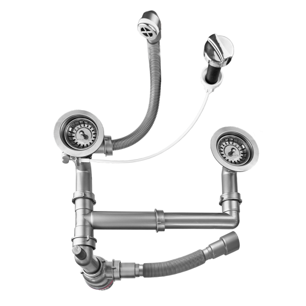 Сифон для кухонной мойки на 2 чаши с полуавтоматическим управлением пробкойСовременный сифон для двухчашевой кухонной мойки с полуавтоматической системой открытия/закрытия пробки — удобное управление без необходимости контакта с водой. Регулируемая конструкция обеспечивает простой монтаж на мойки из нержавеющей стали и искусственного камня. В комплекте — все необходимые переходники, крепежи и уплотнители для герметичного подключения.Ключевые особенности:? Полуавтоматический механизм – плавное открытие/закрытие пробки поворотом ручки? Регулируемая конструкция – подходит для моек разной конфигурации? Универсальный монтаж – крепеж для нержавейки и искусственного камня? Отвод для посудомоечной машины – удобное подключение техники? Гибкая настройка – регулировка угла (60°–90°) и расстояния между чашами (210–370 мм)Комплектация:- 2 вида переливов (под разные типы моек) - Переходник на 90° (40?70 мм / ?25 мм) - Набор евроболтов (2?40 мм + 1?25 мм) - Универсальные уплотнители для герметичности Технические параметры:? Габариты: 290?520?350 мм? Регулируемая длина гофры: 360–810 мм? Регулировка высоты: до 10 см? Диаметр слива: 90 мм? Диаметр чаш: 114 мм? Подключение к канализации: 40/50 ммИдеальное сочетание удобства, функциональности и стиля для современной кухни!