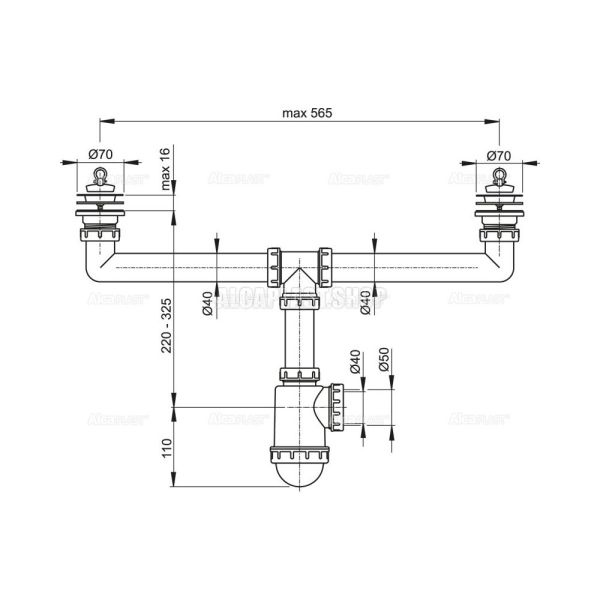 Сифон для двойной мойки AlcaPlast с нержавеющими решетками ?70 без штуцера A449-DN50/40 купить