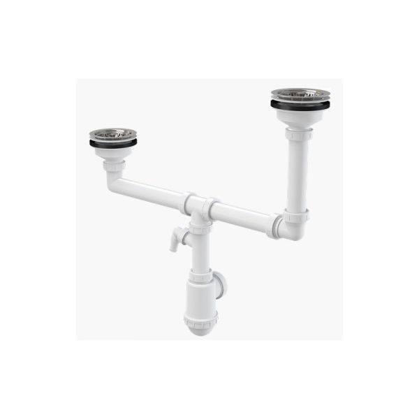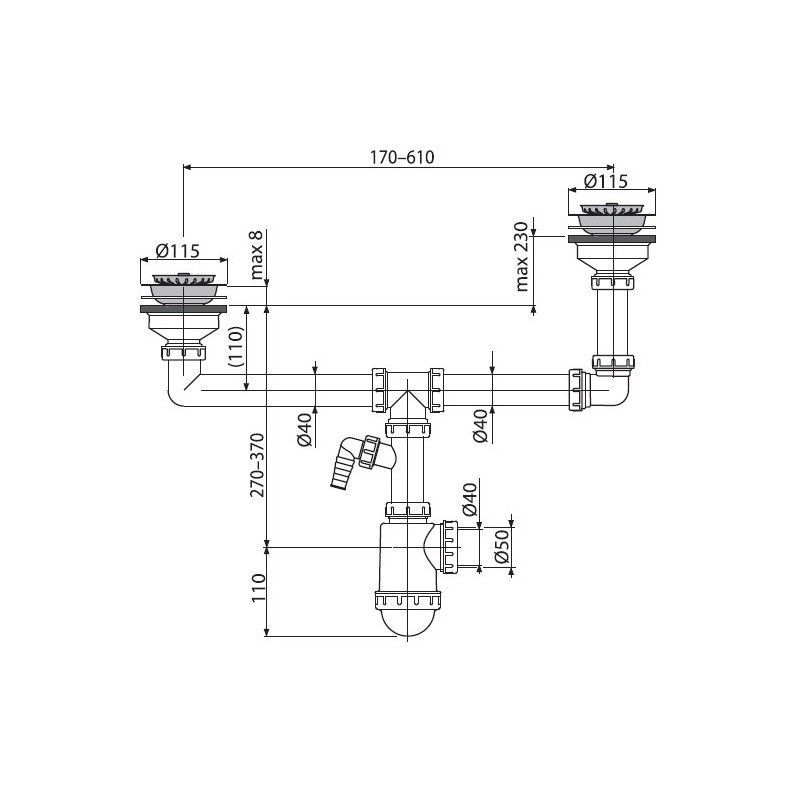 Сифон для двойной разноуровневой мойки AlcaPlast с нержавеющими решетками ?115 и подводкой A454P