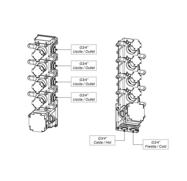 Скрытая часть Gessi Inciso для термостата высокой производительности — это первоклассное решение для современных ванных комнат. Она предлагает возможность подключения как в вертикальном, так и в горизонтальном положении, что обеспечивает гибкость установки в любых условиях. Элегантный хромированный цвет придает изделию стильный и современный вид, подчеркивающий дизайнерский подход.