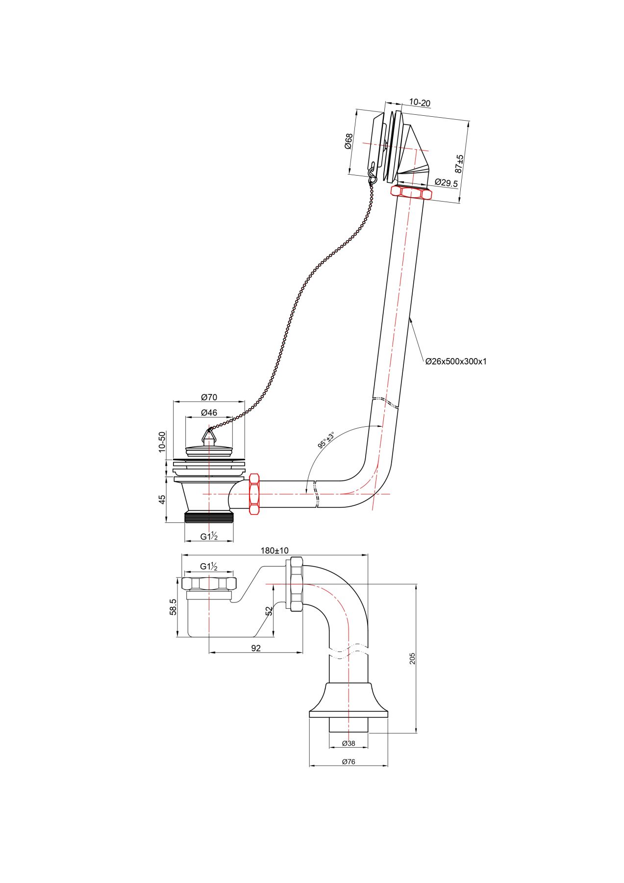 Washbasin 3001.01 CR Слив-перелив 95* для отдельностоящих ванн (Атрия, Ретро, Капри, Мальборо, Монако, Лотус, Прима), хром